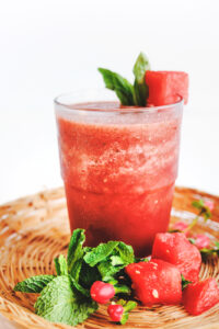 Chop the watermelon and remove any seeds. Place into a blender with the basil and mint leaves. Taste and add more herbs if desired. Garnish with lime wedge and basil leaves.