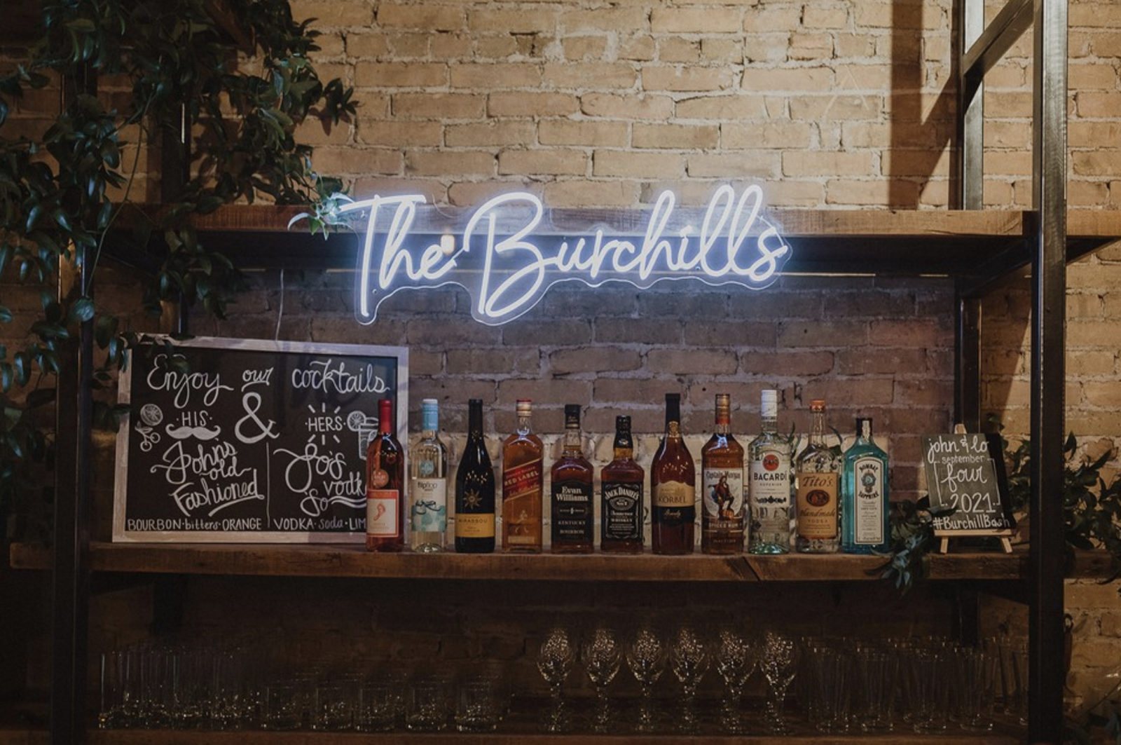 Neon signs can be both elegant and festive and can match many wedding styles. Some couples choose to design the sign with their first or last names, while others select fun phrases, such as Better Together, All you need is Love, Crazy in Love, Love Wins, ‘Til Death, Happily Ever After, and It was always you. Others choose to adorn the bar area with neon signs that say Cheers, Let’s Party, or Drunk in Love.