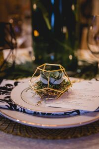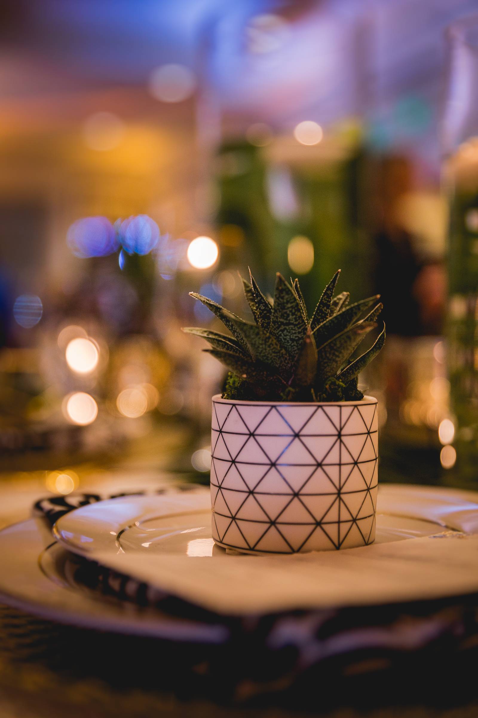 Incorporate potted plants along the aisle or at place settings and centerpieces for a simple, organic, less is more style.