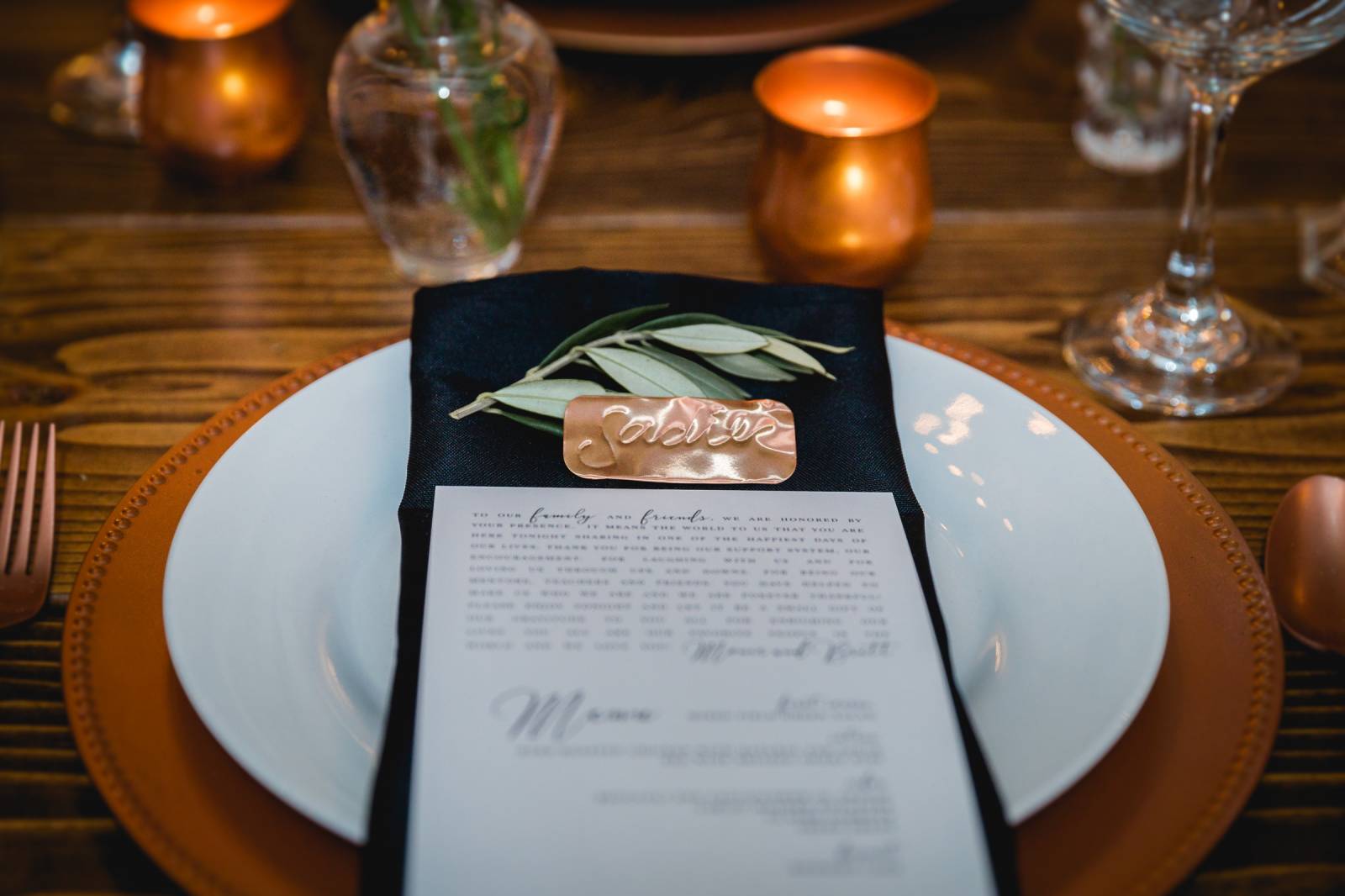 Create more element with floral installations with ceremony arches or tables like this beautiful installation draped in lush greenery on copper.
