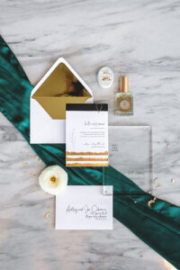 Timeless. Classic. With a bit of modern flair! Twist a simply black, white, and gold look with pops of deep greens and unique textures on your wedding invitations. We love the sleek and clean look the translucent and acrylic details bring to these wedding suites!