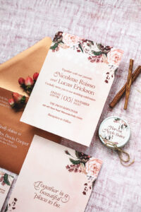 Who doesn’t love some good, elegant rose gold detail to a wedding invitation suite design? We love the rich mauve, rose, and brown tones this palette brings!