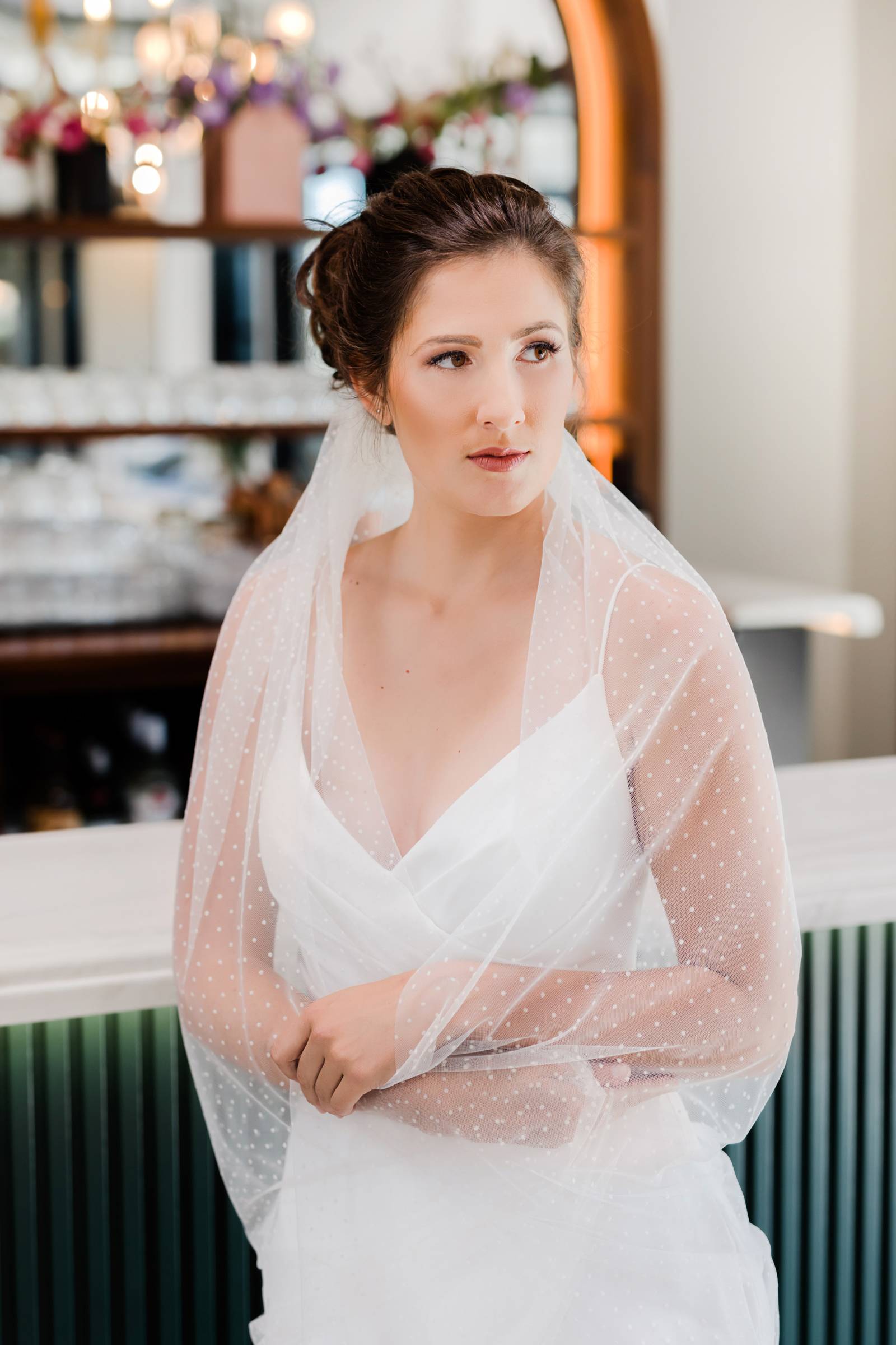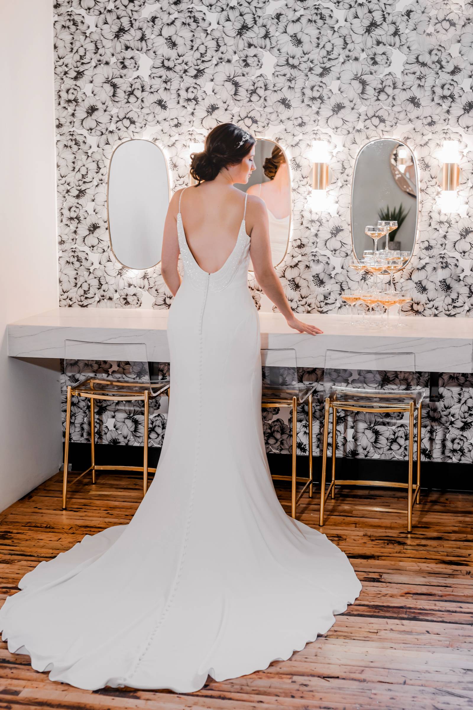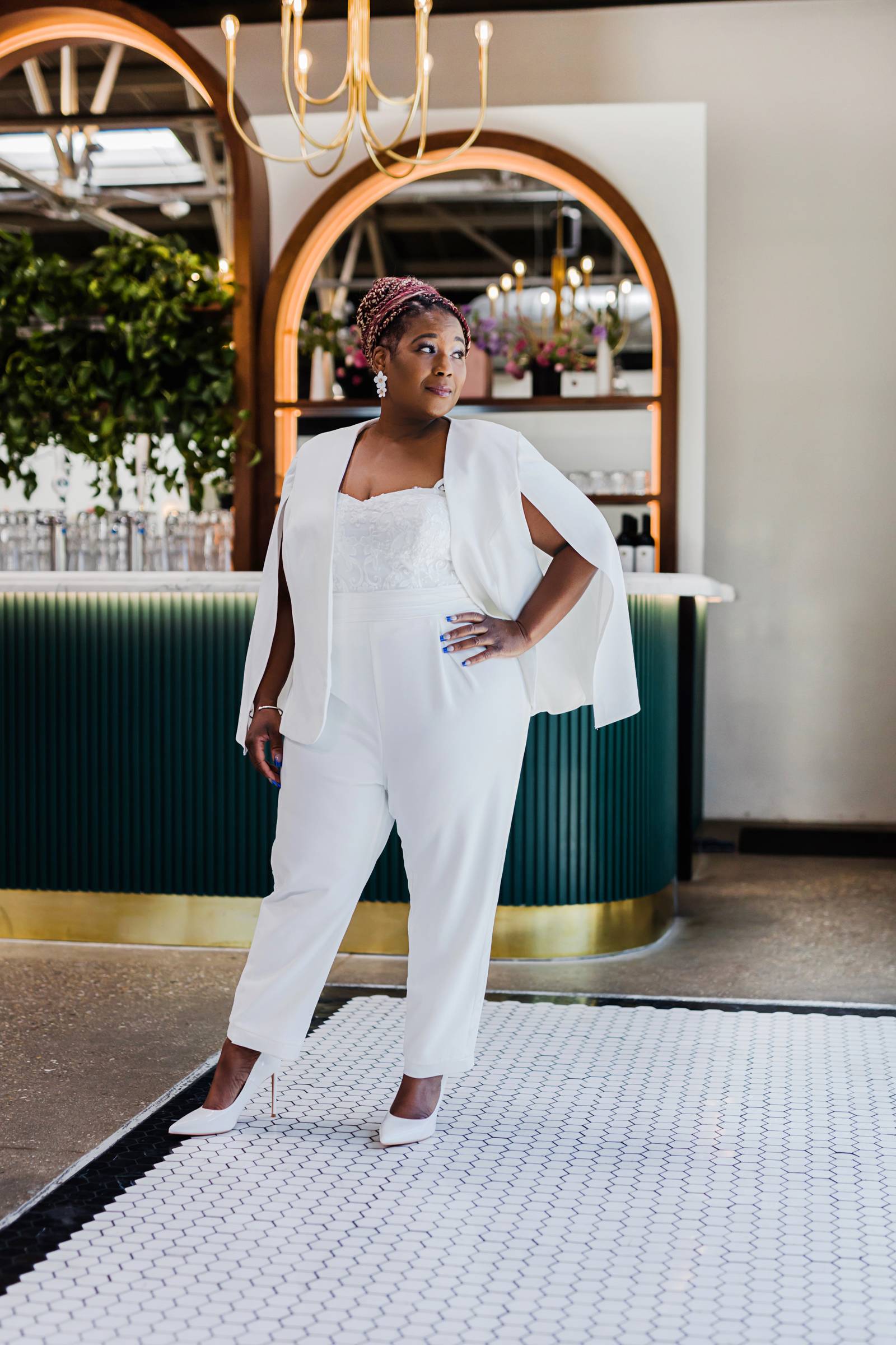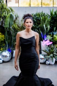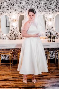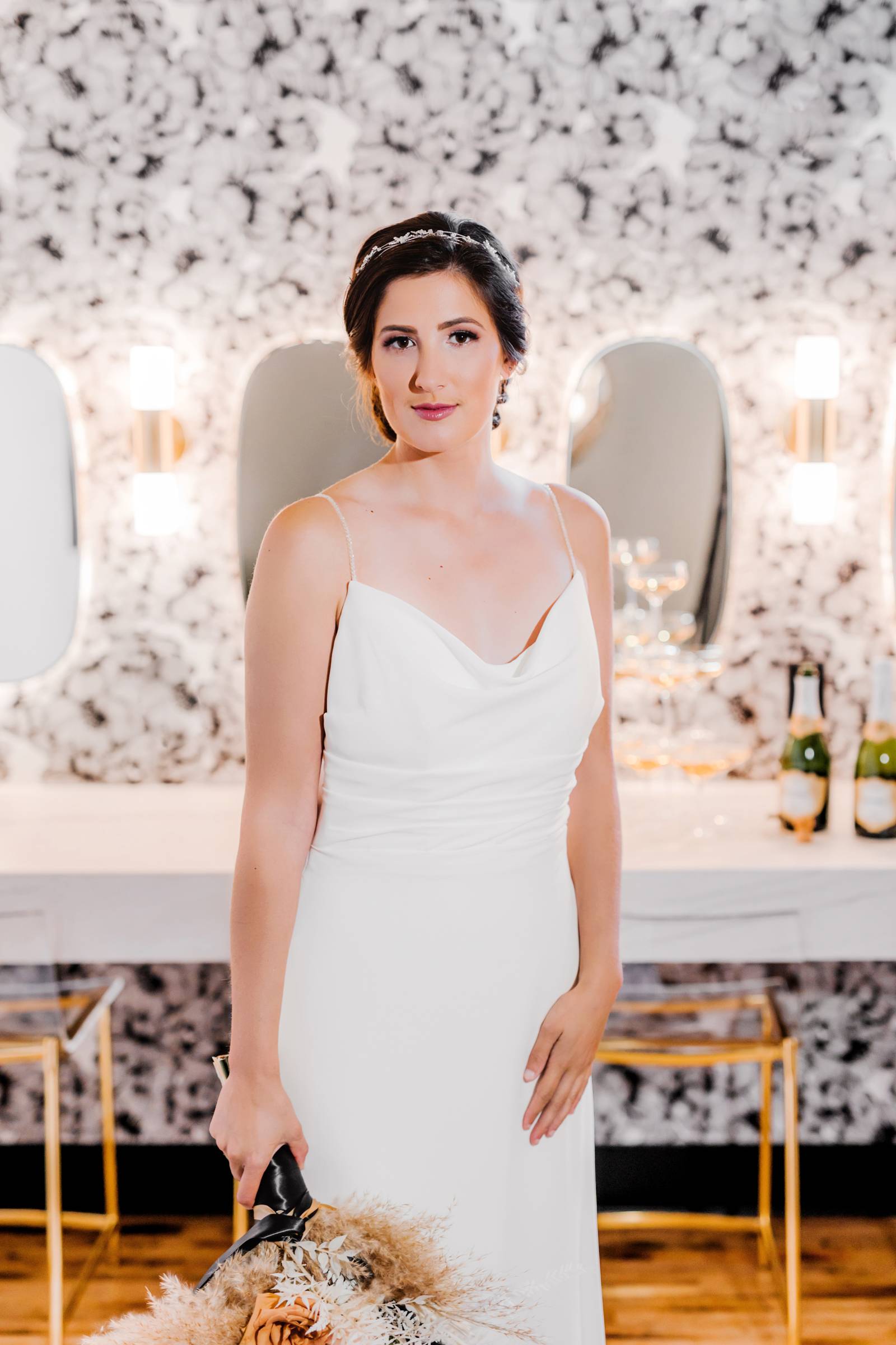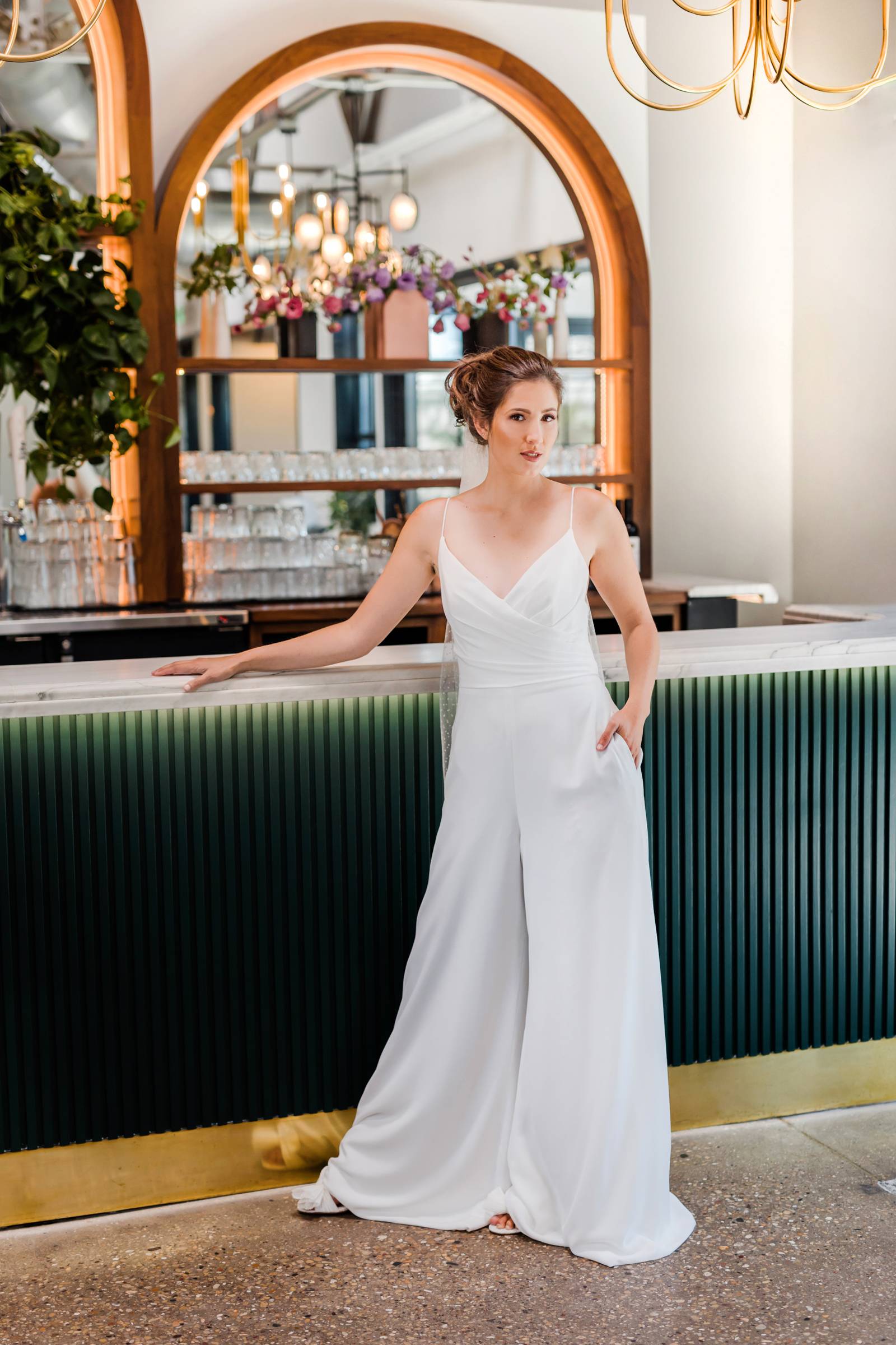 Say hello to modern glam – this sexy style can incorporate so many current trends in bridal fashion, like swiss dot and pearl veils, sophisticated jumpsuits or separates, short and sassy reception dresses, gloves, bows, and bold, glitzy headpieces. This look brings all the ultimate editorial vibes!