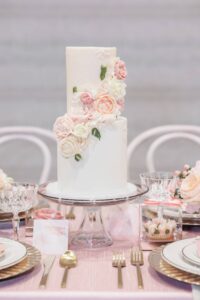 Romance surely was in bloom for this floral-inspired wedding design from LK Bridal Studio. A stunning painted canvas of peonies from Castle Walls served as the perfect ceremony backdrop framed by dreamy pale-pink-hued florals crafted by Surroundings Events & Floral. An elegant beaded gown from Premiere Couture and a light pink suit paired with a floral-patterned undershirt from J. Robert’s Menswear were both fitting for the theme of the occasion.