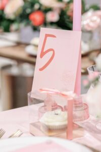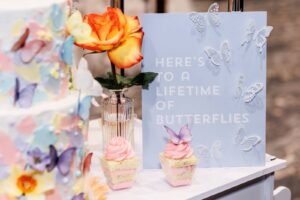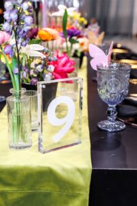 LK Bridal Studio embraced the colorful palette, butterfly theme, and acrylic details with their unique stationery and signage pieces, bringing even more whimsy to the day’s design. From butterfly drink tags to 3D butterfly-themed signage, sleek acrylic table numbers, and arched acrylic invitations, they provided further playfulness and creativity to the celebration!
