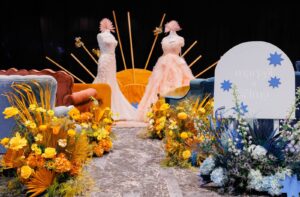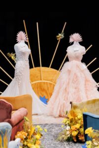Inspired by the funky and dynamic details of Velvet Rentals’ Celestial Chair, Fest Paper and Design creatively coordinated a colorful and quirky wedding look perfect for couples with a playful style! Vera’s House of Bridals fashioned two bridal looks in distinctly different, but equally dramatic, styles including a statement-making pale pink tulle ballgown and a dazzling fit-and-flare dress embellished with all the sparkling details fit for a celebration under the stars.