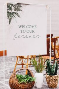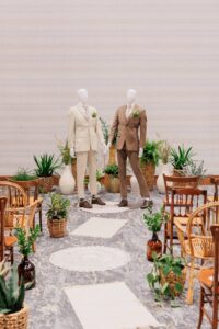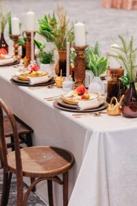 Instead of florals, Melody Rose Designs creatively adopted an authentic woodsy aesthetic, using plants, shrubs, and herbs of varying shapes and sizes to craft a greenery-filled atmosphere for the celebration. Utilizing woven baskets, mismatched wooden chairs, amber glass, wooden candle holders, chargers, stone dishware, and other neutral pieces from their vast rental collection, they intentionally used the natural tones and textures of each decor element to instill a warm and peaceful ambiance throughout the ceremony and reception spaces.