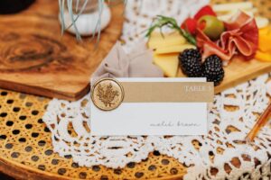 LK Bridal Studio artfully constructed stationery and signage elements fit for a forest wedding nestled in the Wisconsin pines. From their welcome sign guiding guests to the ceremony to an elegant invitation suite featuring soft neutral hues and a unique wood-resembling envelope, as well as coordinating place cards with a custom shimmering gold wax seal for added charm.