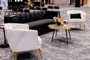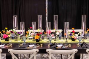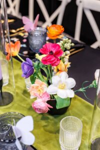Here’s to a lifetime of butterflies! Orange Door Weddings channeled modern whimsy with their new acrylic butterfly chargers, crafting a wedding design ideal for couples seeking an impactful and playful look for their special day. Sleek black rental items from Orange Door’s collection, such as the dramatic Benito Black Backdrop, Modern Table, Black Sofa, Atomic Stars, and more, provided the perfect canvas for other colorful decor elements and bright, bold blooms from B-Style Floral to pop, creating an overall colorful and eclectic event design.