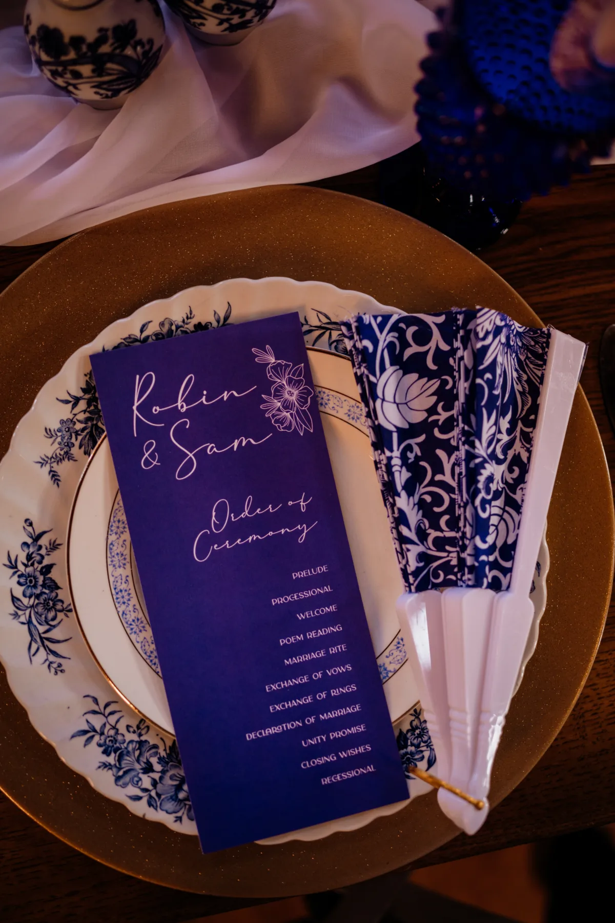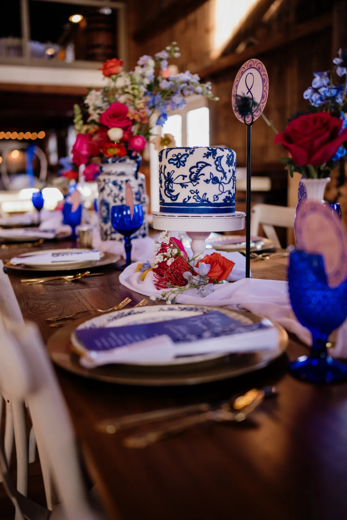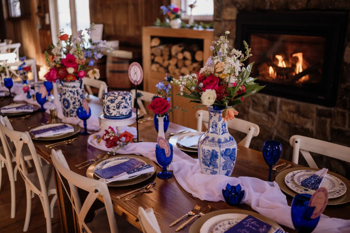 This refined, European-inspired winter wedding design features a palette of rich cobalt, crisp white, and deep red, creating a look that feels both trendy and timeless. Toile de Jouy patterns, a staple of 18th-century France, appear throughout the design, most notably on statement vases and layered stationery by LK Bridal Studio.