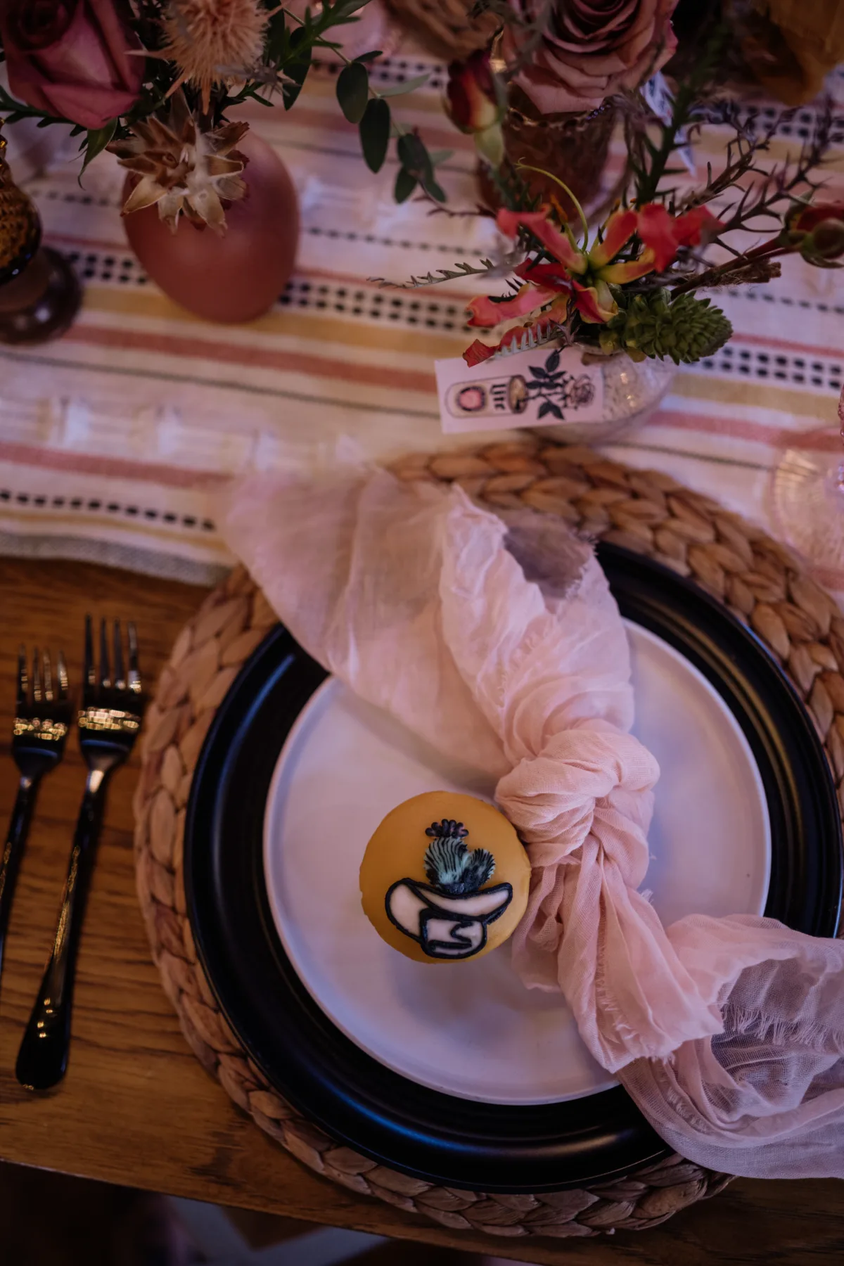 The Sparkling Rosé inspiration balances romance and edge, resulting in an atmosphere that feels both playful and refined. Blush tones and greenery soften the palette, while rich black accents and metallic finishes add contrast and polish. The overall effect is warm and luminous, with a subtle hint of glam.