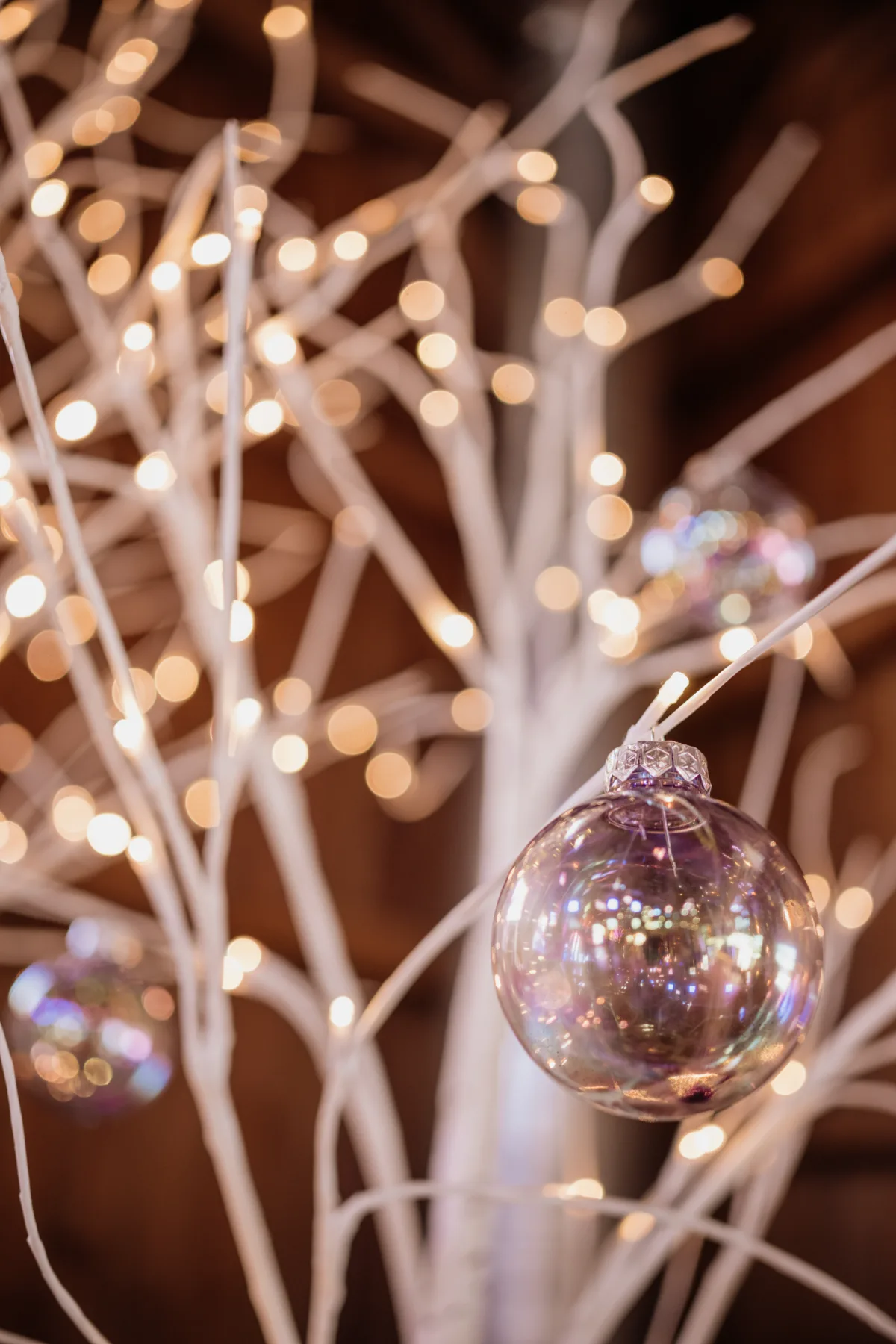 The décor further embraces the season, with tree lights, candles, wooden and glass trees, and bulb ornaments. One of our favorite details is a festive, acrylic layer on the four-tiered wedding cake from Craig’s Cake Shop!