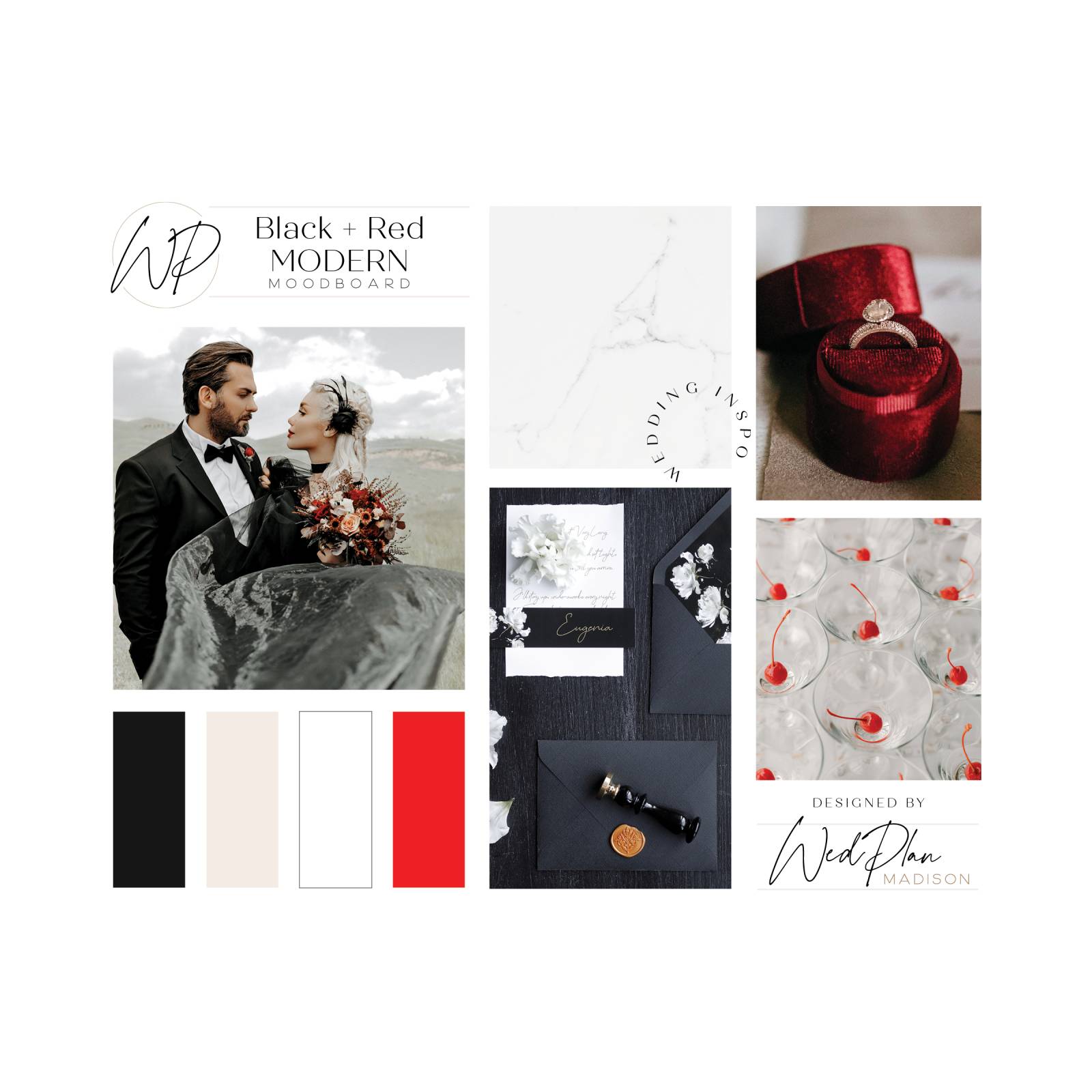 Last but certainly not least, the modern yet timeless look of a black and white wedding palette topped with a pop of vibrant red is unparalleled! This trend embraces contemporary style, sleekness, clear glass or acrylic details, marble finishes, and all of the Vogue vibes.