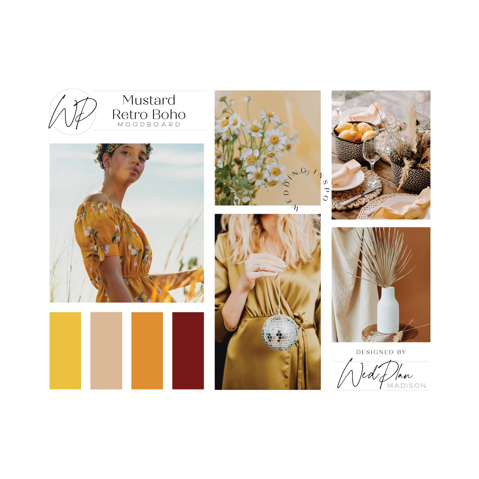 Terracotta tones and boho style are still on the top of the trends list for 2022! This year, mustard yellows, rich oranges, and brick reds continue to weave their way into this bohemian wedding color palette that is perfect for bringing all the 70’s vibes and retro details to the party.