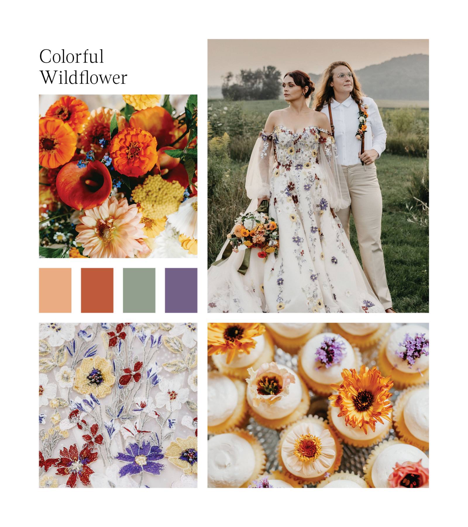Inspired by the vast and vibrant array of colors that wildflowers bring us, this palette is perfect for those wanting a whimsical and floral-filled celebration! Click here for more ideas using this multicolored palette!