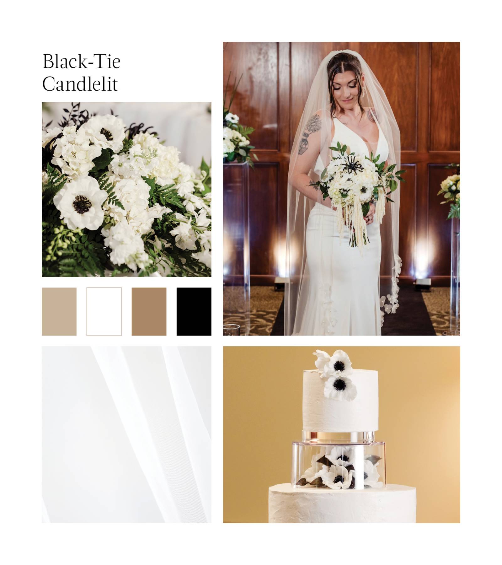 For the couple wanting a classic and sleek event, you can never go wrong with a timeless black-and-white color palette. Layer in some creamy nudes and pops of shimmering gold and you’re on your way to an elegant black-tie affair! Click here for even more elegant wedding inspo.