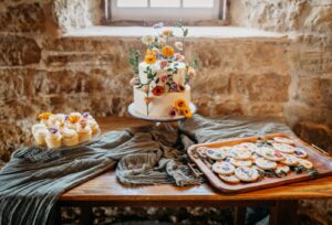 From a simple two-tiered cake design decorated with colorful loose blooms and complementing fluffy white cupcakes to sugar cookies baked with edible florals, Sandy Kakes created a dessert table that was almost too pretty to eat!