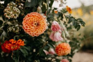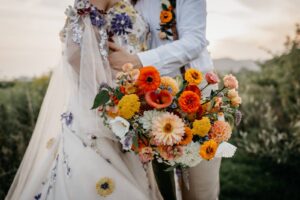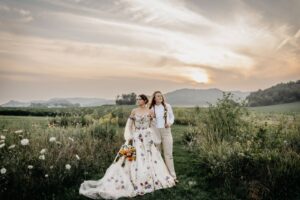 Coordinated and designed by Copper Feather Events, featuring Rhonda Rogers Photography, Hello Darling Films, Sunborn Gardens, Liberty Lane Design, Sandy Kakes, Lily’s Magical Treats, Vera’s House of Bridals, Lovely Elegance Hair & Makeup, Event Essentials, Cedar & Spice, Stir Shake & Sip, and A Bushel & A Peck, prepare to be whisked away into the whimsy of this colorful country affair, where our couple’s love shines even brighter than the brightest bloom.