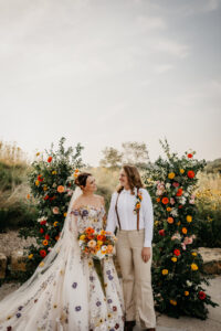 Sunborn Gardens artfully created lush, statement-making pillar florals as an eye-catching ceremony backdrop. Their seasonal farm-grown summer blooms and incredible floral artistry were a highlight of this wildflower-inspired wedding design, bringing vibrant color and natural whimsy to every part of the day.