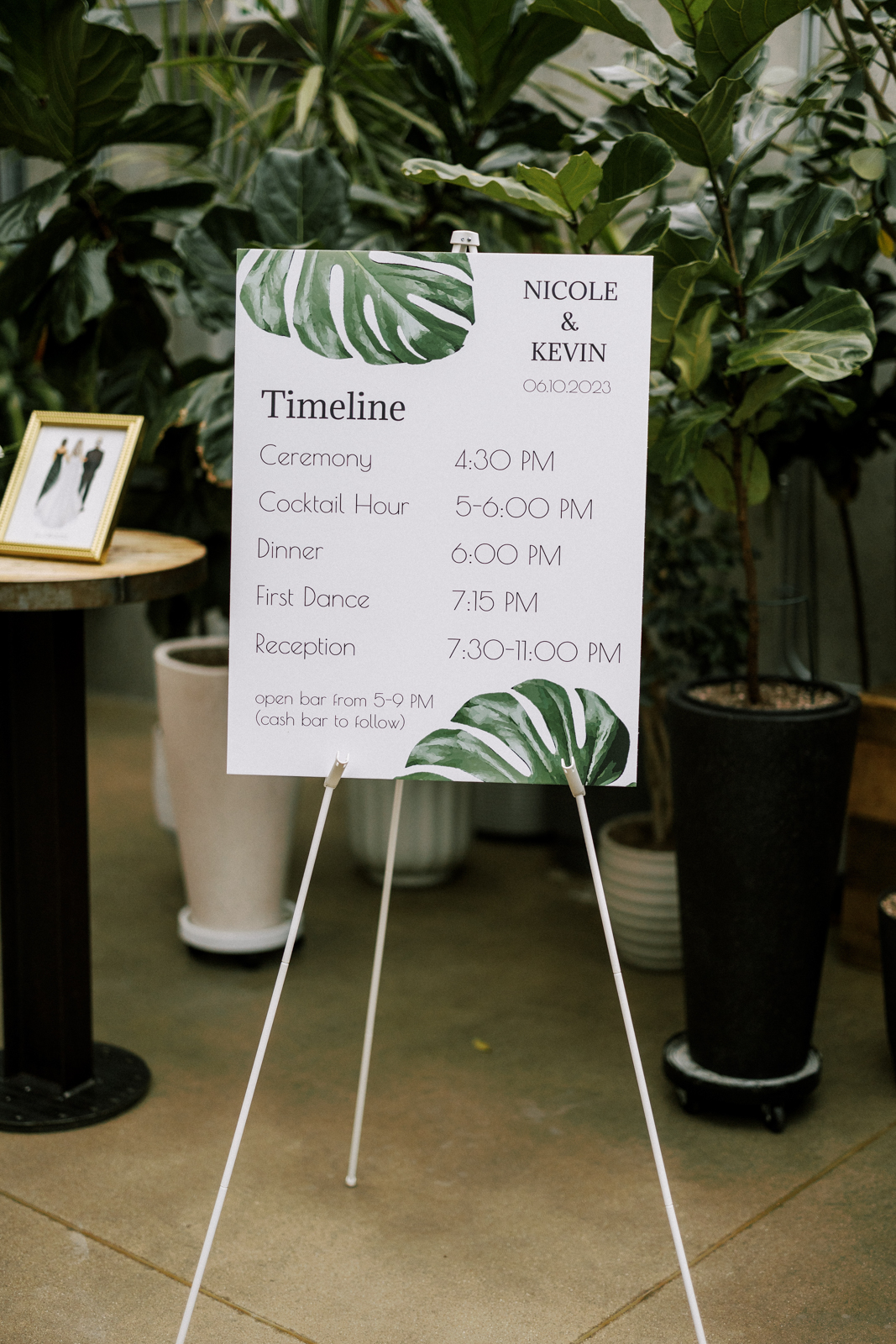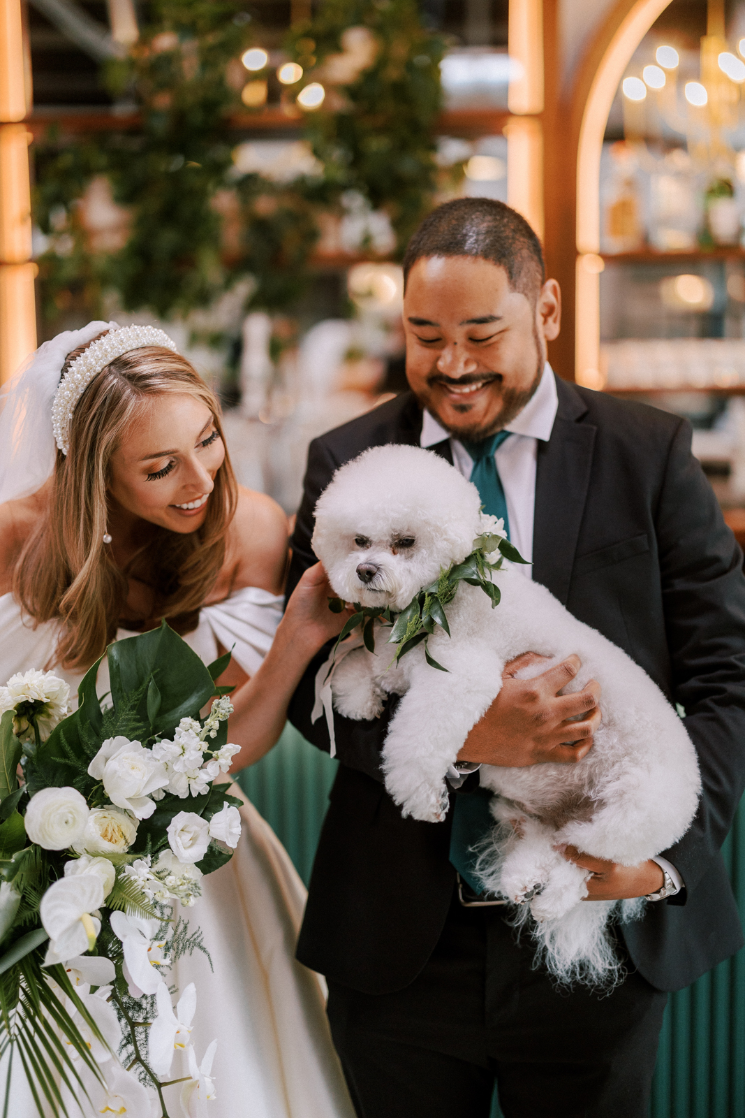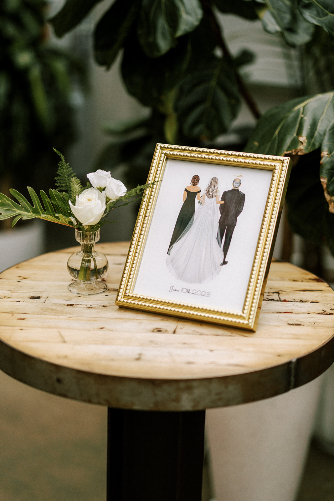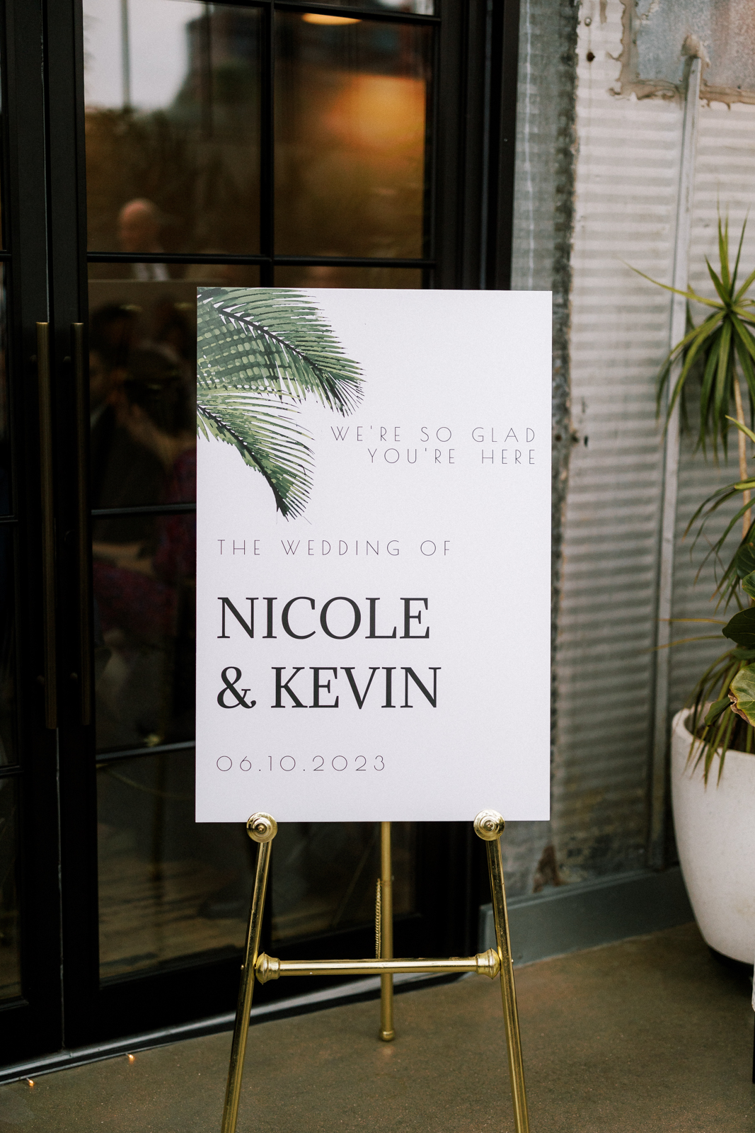 The couple infused their day with many personal touches. Nicole’s family dog, Ellison, joined her while getting ready and even took part in the ceremony. To honor lost loved ones, Nicole incorporated jewelry from her two grandmothers into her bridal look and reserved a seat for her late father during the ceremony. A beautiful, custom-rendered photo was also showcased of him walking her down the aisle. From the stunning statement palms to these deeply sentimental details, we can't wait for you to dive into Kevin and Nicole’s special celebration below!