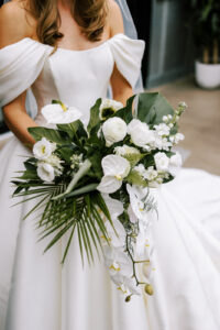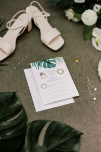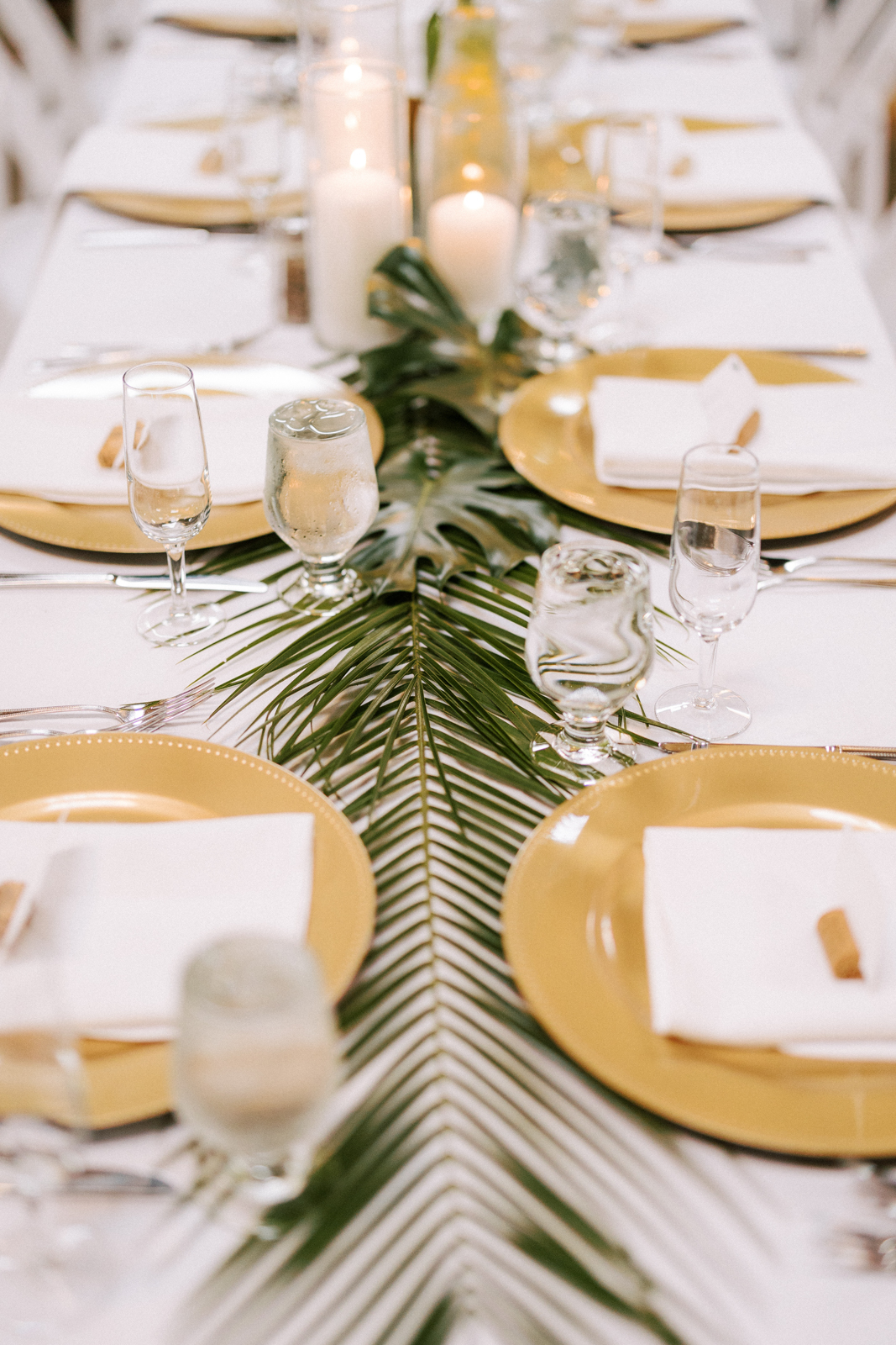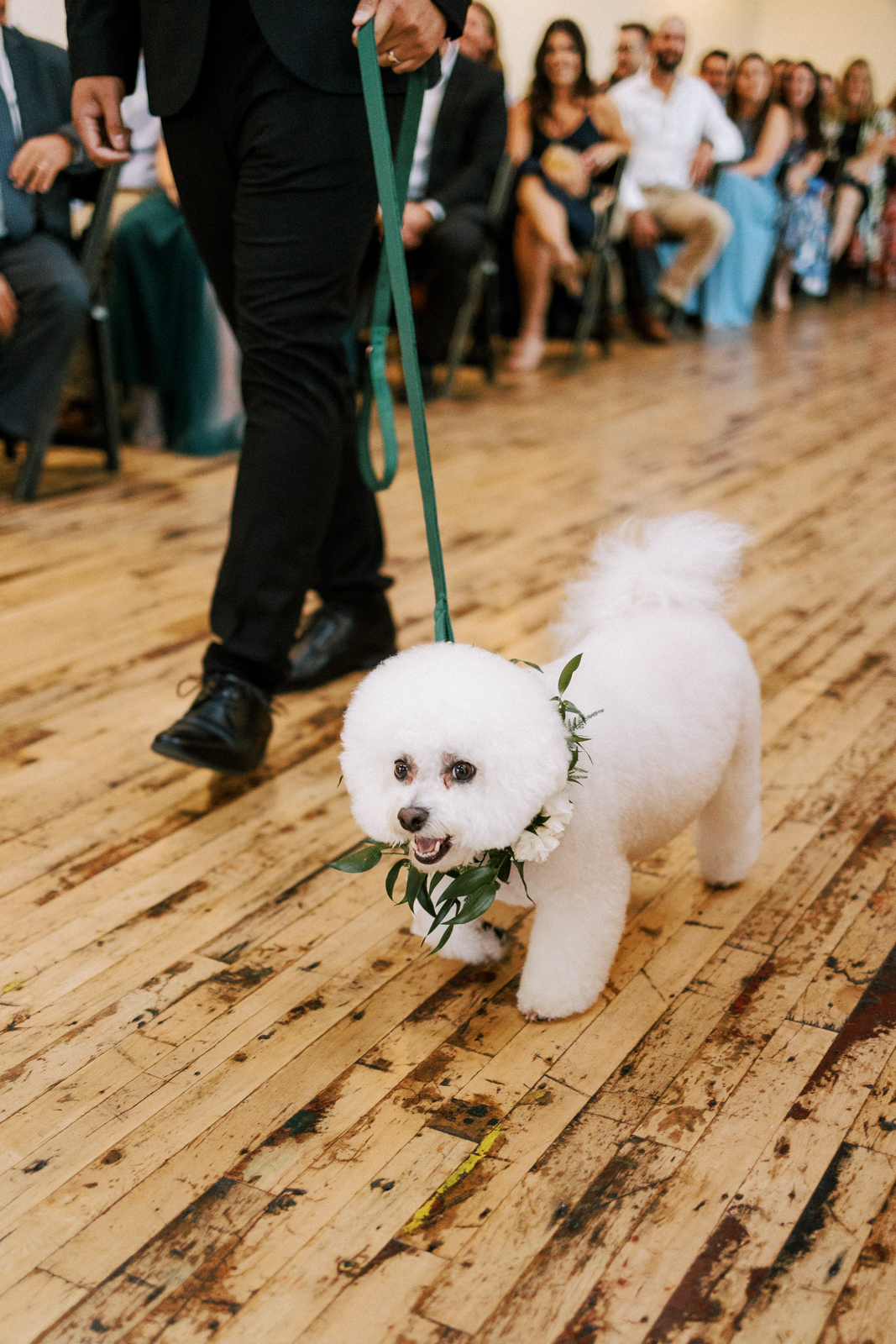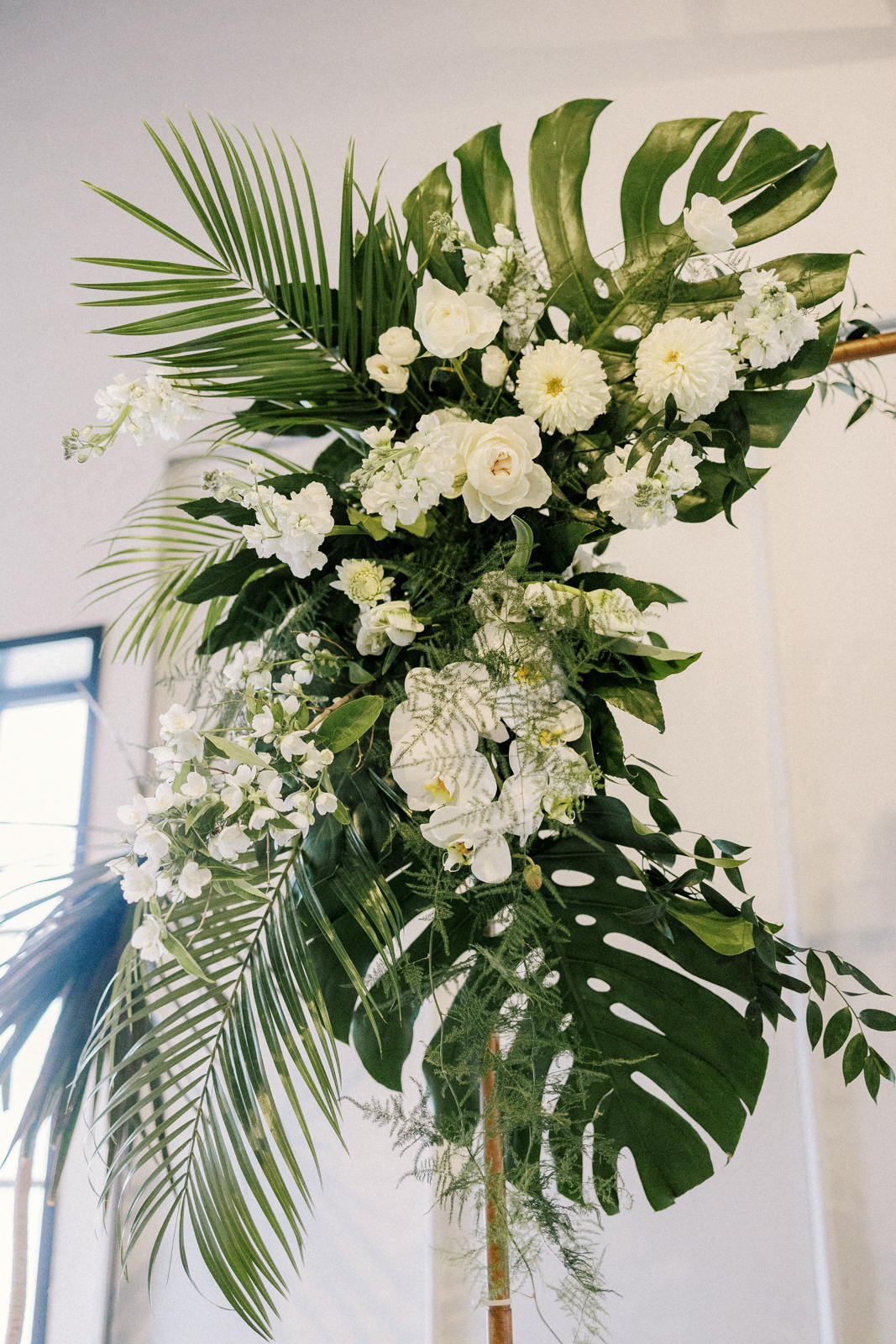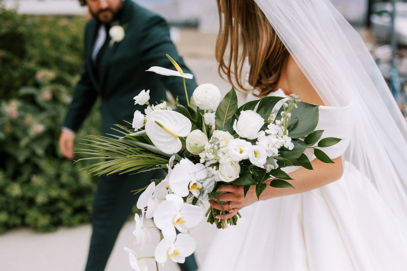 The couple infused their day with many personal touches. Nicole’s family dog, Ellison, joined her while getting ready and even took part in the ceremony. To honor lost loved ones, Nicole incorporated jewelry from her two grandmothers into her bridal look and reserved a seat for her late father during the ceremony. A beautiful, custom-rendered photo was also showcased of him walking her down the aisle. From the stunning statement palms to these deeply sentimental details, we can't wait for you to dive into Kevin and Nicole’s special celebration below!