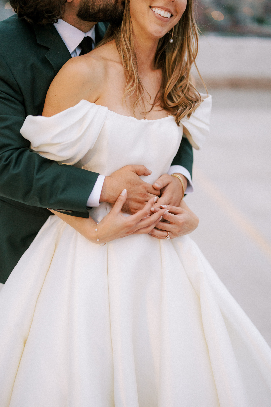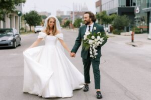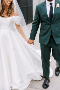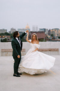 After Kevin’s elementary school crush, Nicole, moved away following 5th grade, the two miraculously reconnected in college at UW Madison. Kevin, working as a bouncer at a bar, let Nicole and her friends skip the line in exchange for her number (pretty smooth, right?). Their first date was at the Memorial Union Terrace, where they quickly realized they were destined for each other. Although grad school led to years apart, they survived a 4-year long-distance relationship, which only strengthened their bond. After being coupled up in a one-bedroom apartment together 24/7 during the pandemic, the two planned a trip to their favorite vacation spot, New Orleans, where Kevin finally popped the question during a stroll along the water.