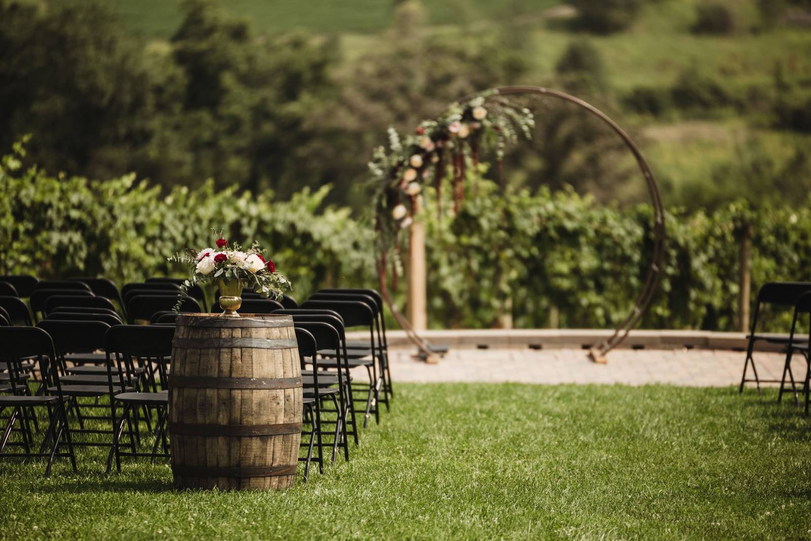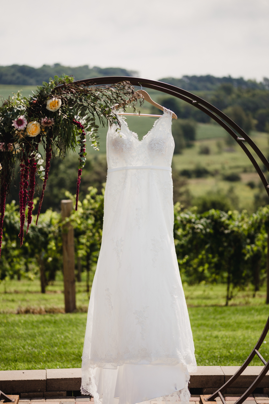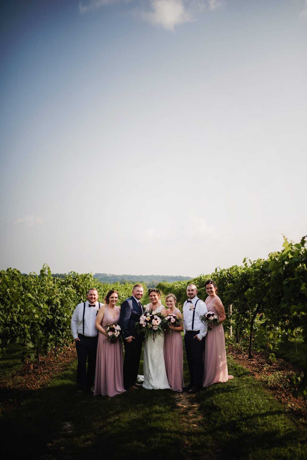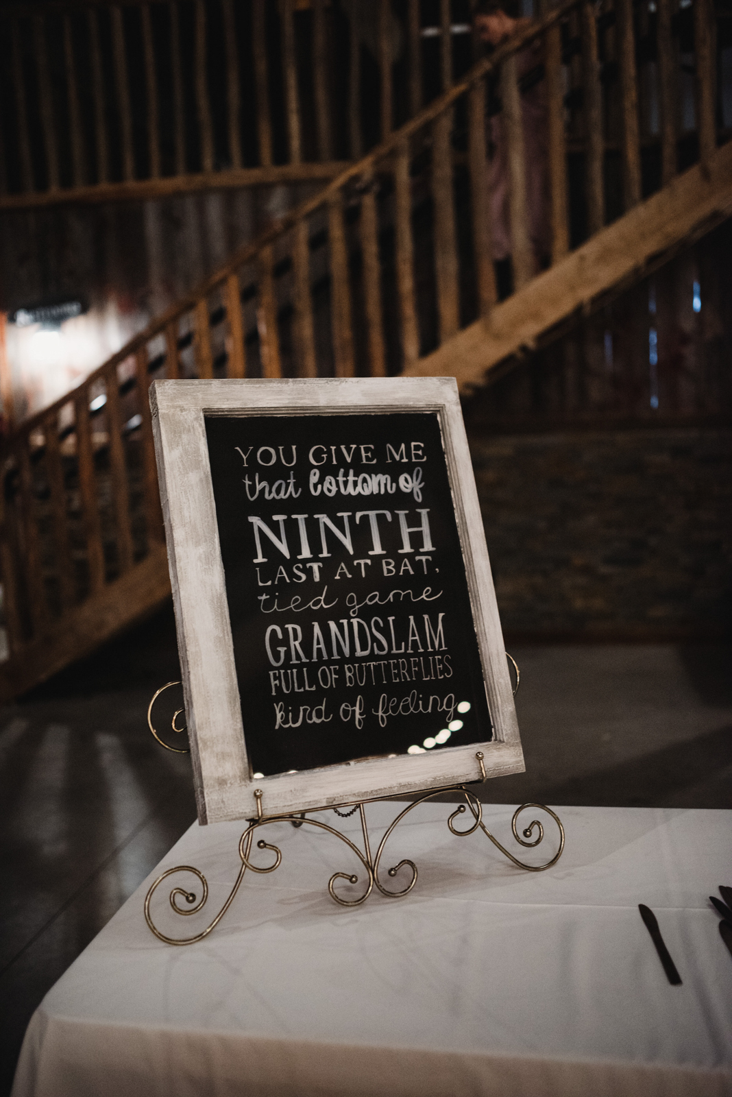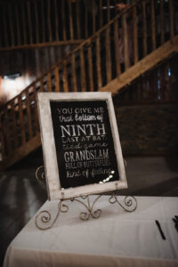TELL US ABOUT THE FOOD, DESSERT, AND ANY SPECIALTY BEVERAGES ON THE MENU: All the recipes were mine, allowing me to illustrate my culinary arts degree and because I am very passionate about food. They were all very personal to me and some of our family favorites. Our pre-dinner food was bruschetta with parmesan garlic toast, spinach dip, and an assortment of Italian meats and cheeses to go with the wine theme. The main meal was baseball-themed because my husband is a huge sports fanatic. My uncle made smoked brisket and pulled pork, and our caterer grilled mini hot dogs served on mini hot dog buns. We also had pretzel bites with beer cheese dip, broccoli salad, and loaded baked potato salad. For dessert, we had multiple desserts bars including, lemon squares, strawberry crumble, and turtle bars. Our wedding cake was maple with a cream cheese frosting. We served the wine from the vineyard and had an open bar of mixed drinks. And of course, since the wedding was in Wisconsin, my uncle made some homemade peach pie liquor that we all got to enjoy.