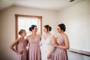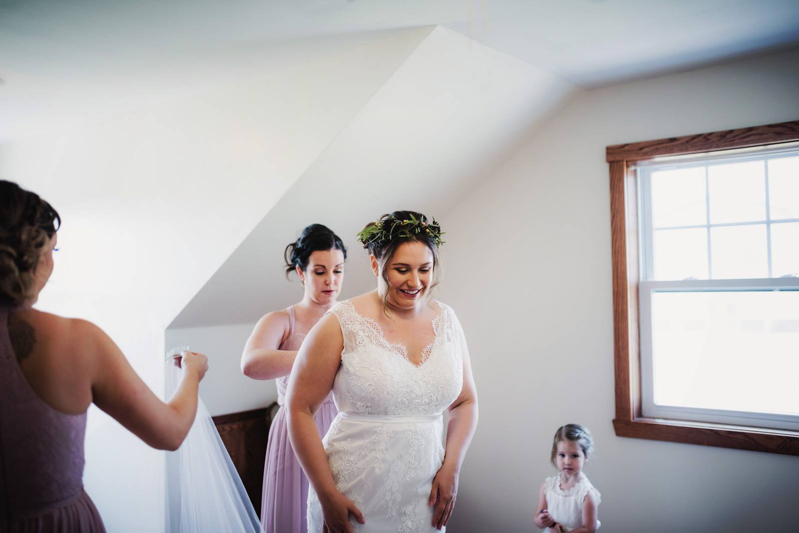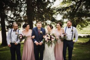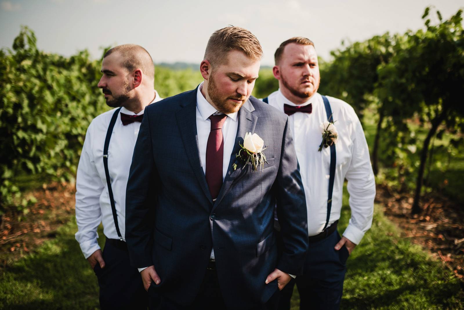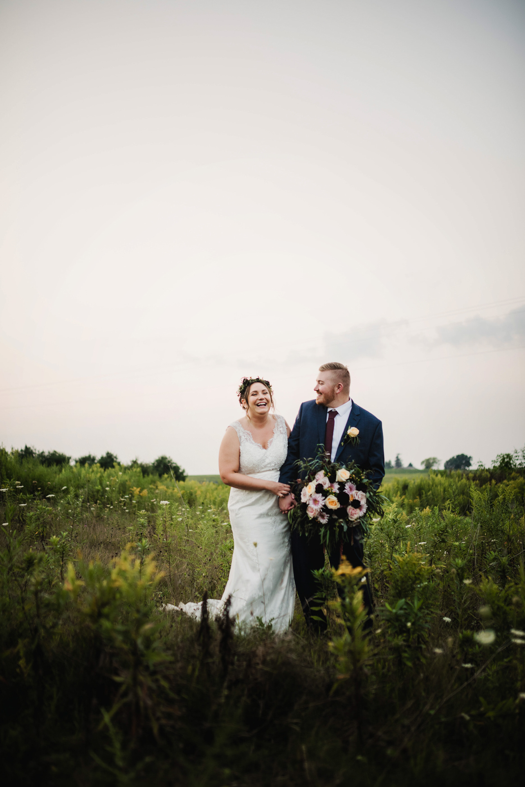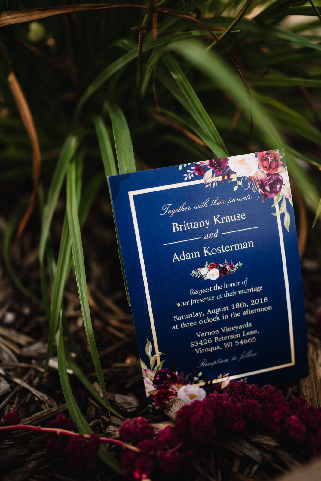 TELL US ABOUT THE FOOD, DESSERT, AND ANY SPECIALTY BEVERAGES ON THE MENU: All the recipes were mine, allowing me to illustrate my culinary arts degree and because I am very passionate about food. They were all very personal to me and some of our family favorites. Our pre-dinner food was bruschetta with parmesan garlic toast, spinach dip, and an assortment of Italian meats and cheeses to go with the wine theme. The main meal was baseball-themed because my husband is a huge sports fanatic. My uncle made smoked brisket and pulled pork, and our caterer grilled mini hot dogs served on mini hot dog buns. We also had pretzel bites with beer cheese dip, broccoli salad, and loaded baked potato salad. For dessert, we had multiple desserts bars including, lemon squares, strawberry crumble, and turtle bars. Our wedding cake was maple with a cream cheese frosting. We served the wine from the vineyard and had an open bar of mixed drinks. And of course, since the wedding was in Wisconsin, my uncle made some homemade peach pie liquor that we all got to enjoy.