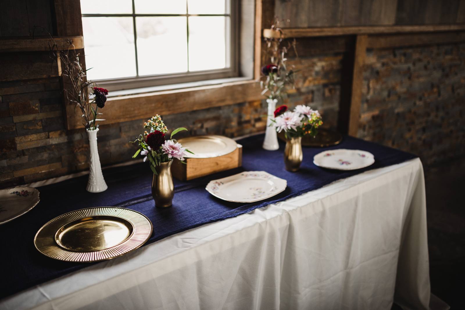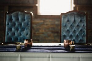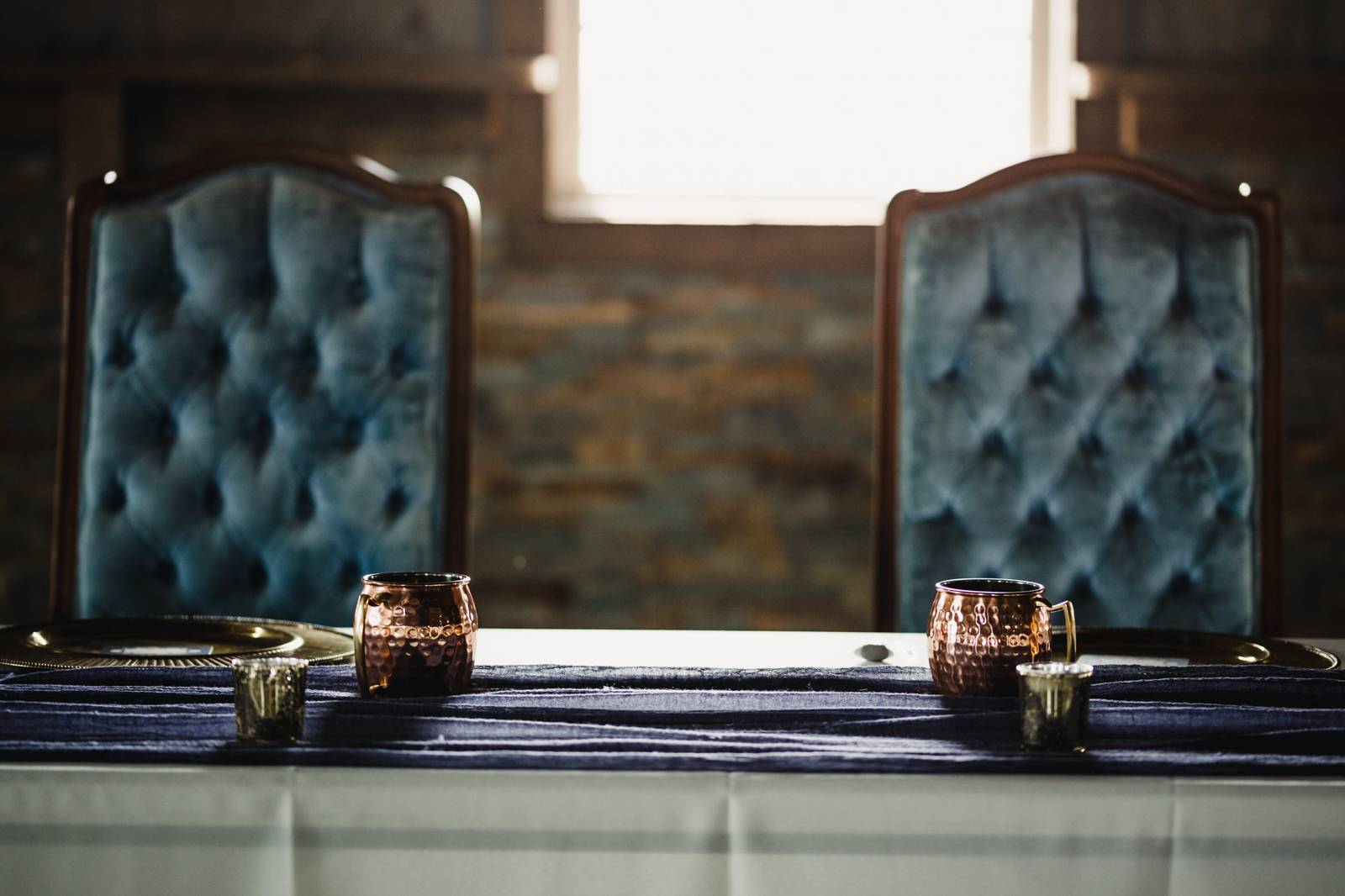 DID YOU USE ANY SPECIALTY CHAIRS, LINENS, CHARGERS, GLASSWARE OR DINNERWARE? We rented two blue velvet wingback chairs for the head table, a white vintage sofa that we took pictures on in the vineyard, and copper mugs for the wedding party for beverages. We purchased crystal and gold platters for the food. Our cake was atop an antique cake stand I found on Etsy. It was beautiful and white with flowers.