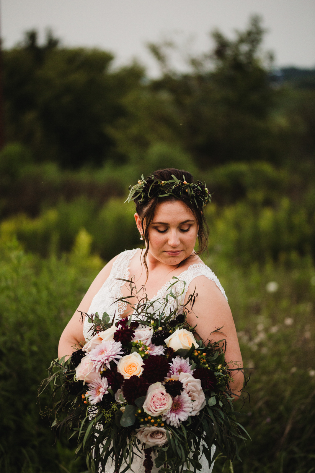 DESCRIBE YOUR WEDDING FLOWERS: My flowers were the most beautiful flowers I have ever seen. I had red hanging amaranthus, burgundy-black dahlias, quicksand roses, blackberry scaboisa, yellow peach hypericum berries, true-blue eucalyptus, and misty mauve cremon.