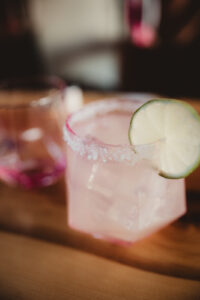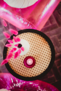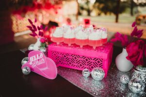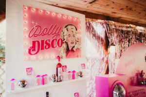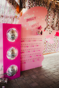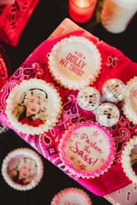 LK Design also created a drink display wall, complete with disco ball escort cups, drink labels, and custom alcohol bottles. Their themed drink signage extended to the bar, where “A Cup of Ambition” was the signature drink. Finally, a large, glowing sign showcased an illustration of Mrs. Parton. Adorned with Edison bulbs reminiscent of a theatre marque, the sign lit up the party!