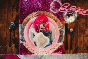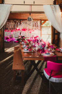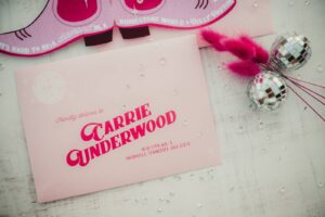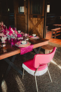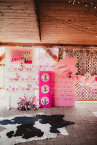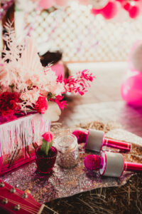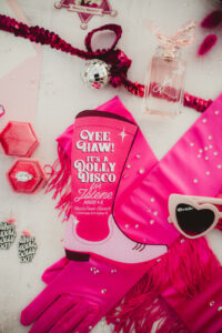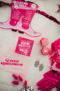 When it comes to LK Bridal Studio’s stationery pieces for this western bach bash, the Dolly is in the details! The team began by designing a cowboy-boot-shaped invitation that, when opened to display, became a prized pair of hot pink boots, complete with rhinestones, a disco ball, and the itinerary for an exciting bachelorette weekend! Pairing a bold, vintage serif with a rope script font seamlessly combined the country charm with the disco glamour of the celebration.