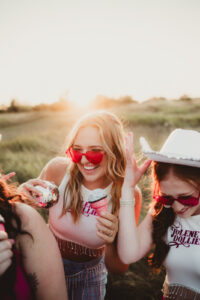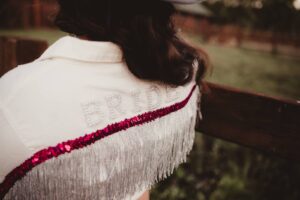 Like the Queen of Country herself, each of LK’s custom day-of pieces was bright, bold, and sassy, paying clever homage to Dolly’s iconic style. The bridesmaids and bride-to-be wore custom fringed cropped shirts, trucker hats, and sheriff badge swag stickers featuring Dolly Herself.