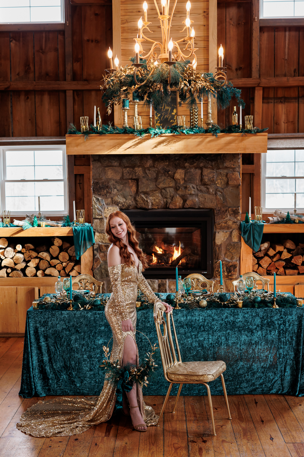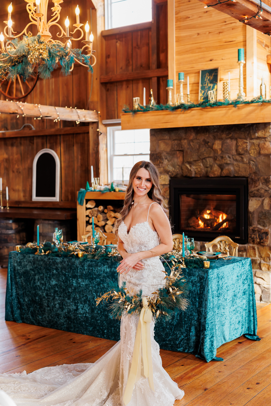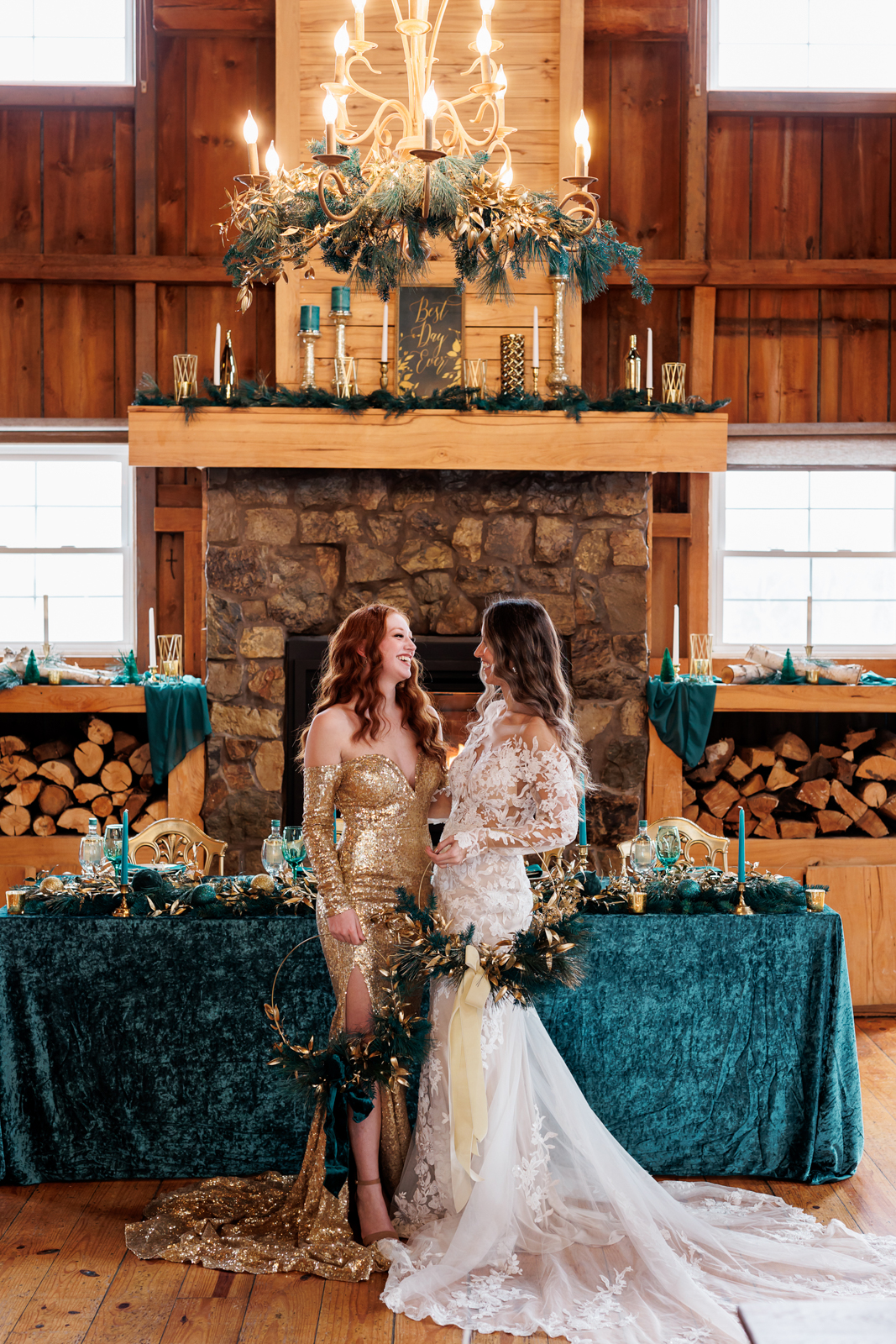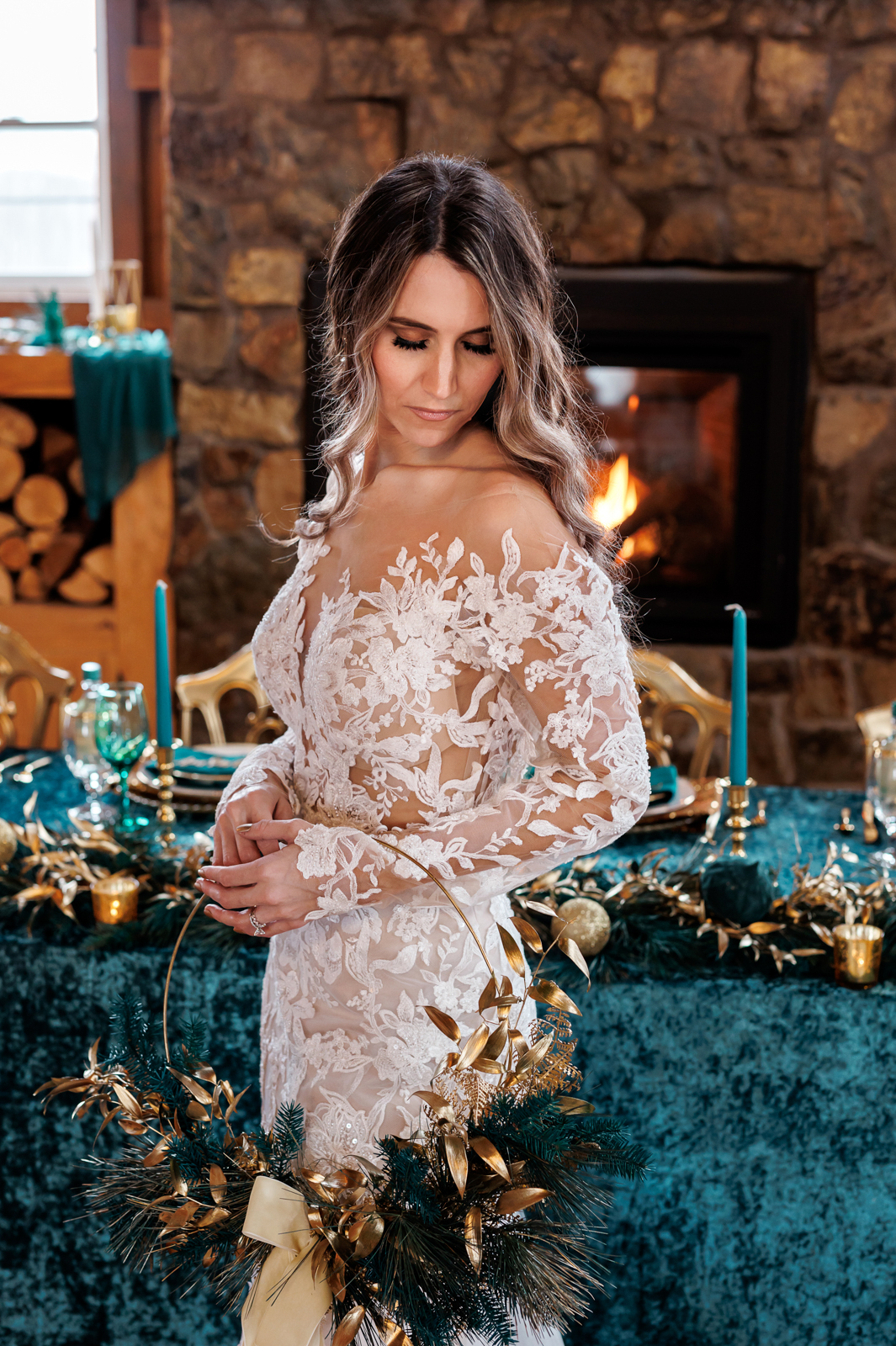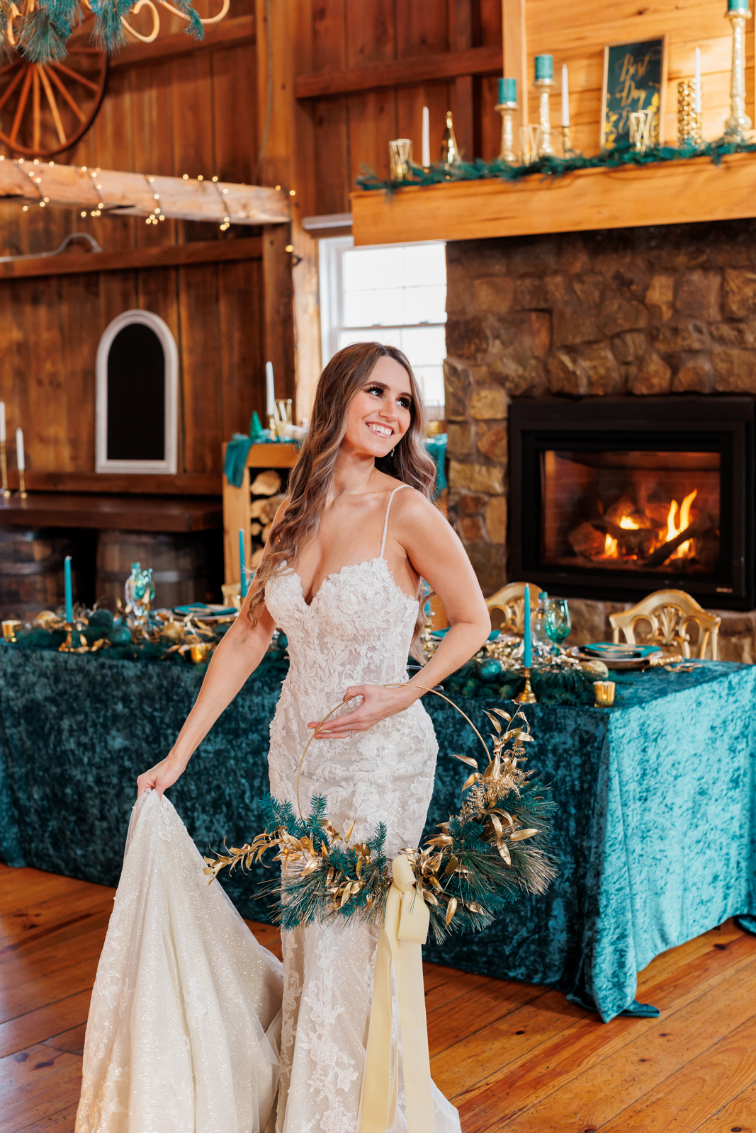 Rich, velvety teal and shimmering gold details created a unique and captivating winter wedding design at Harvest Moon Pond, bringing all the glam of a near-Christmas wedding without the traditional red and green color palette. With coordination, design, floral, and rentals by Melody Rose Designs, the charming barn space was transformed into an elegant and cozy winter wonderland. Sprayed evergreen branches and gold-painted ruscus were creatively arranged as garlands, draping across the reception table, chandeliers, and fireplace mantle and forming unique hoop bouquets for the bride and her maid of honor!