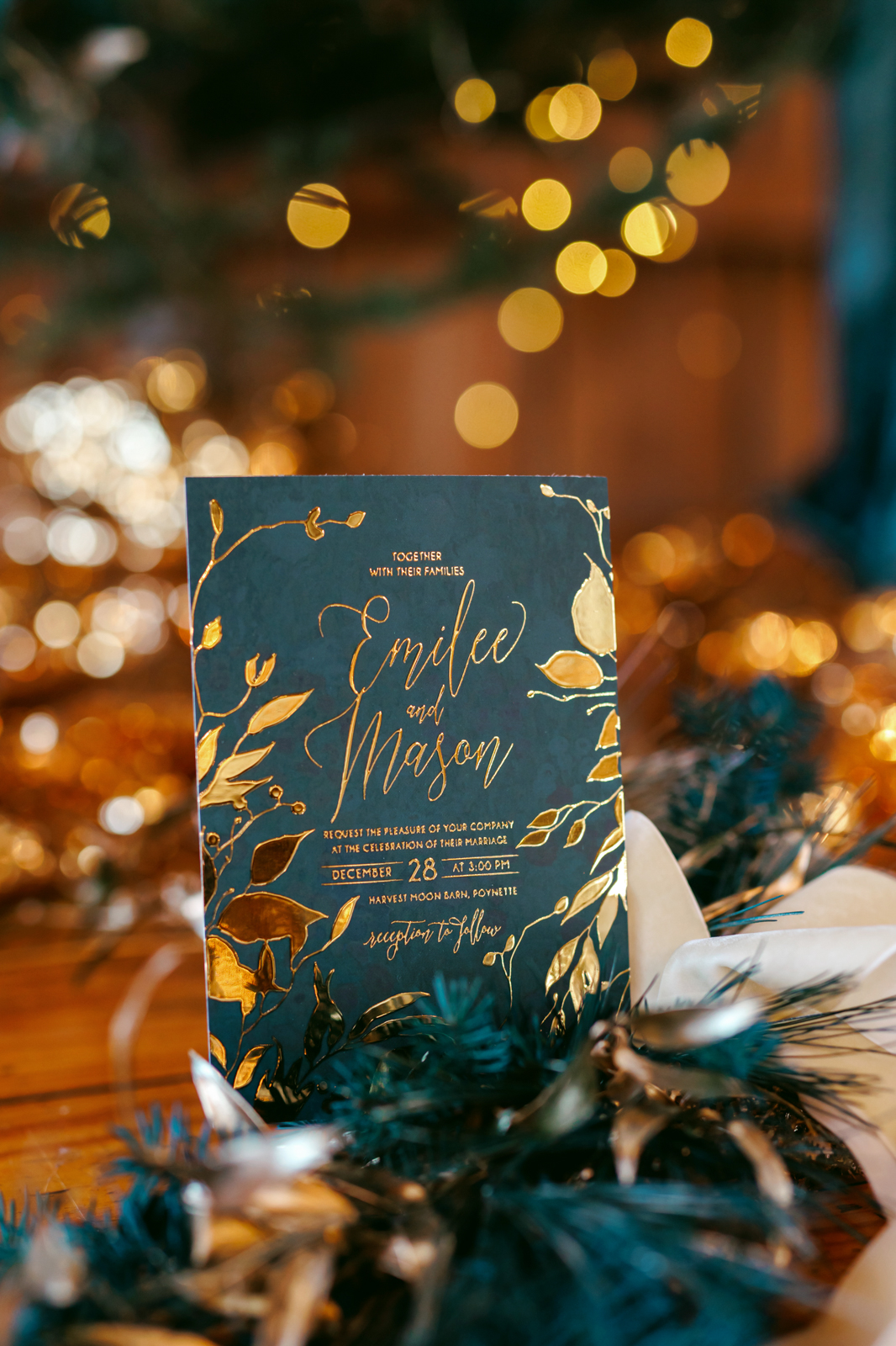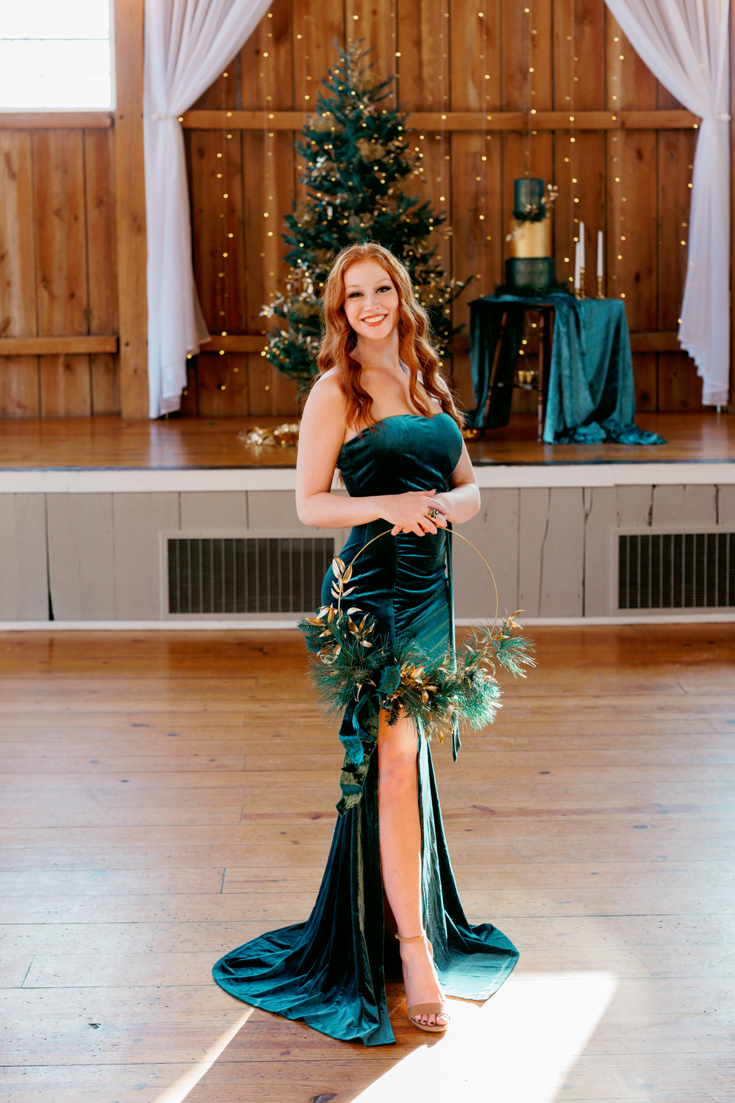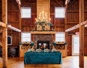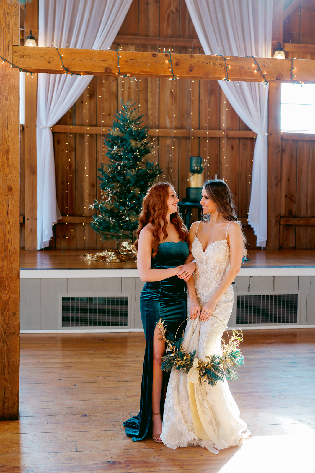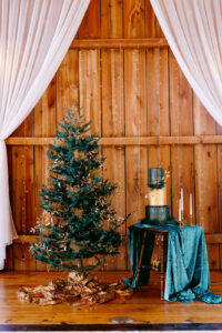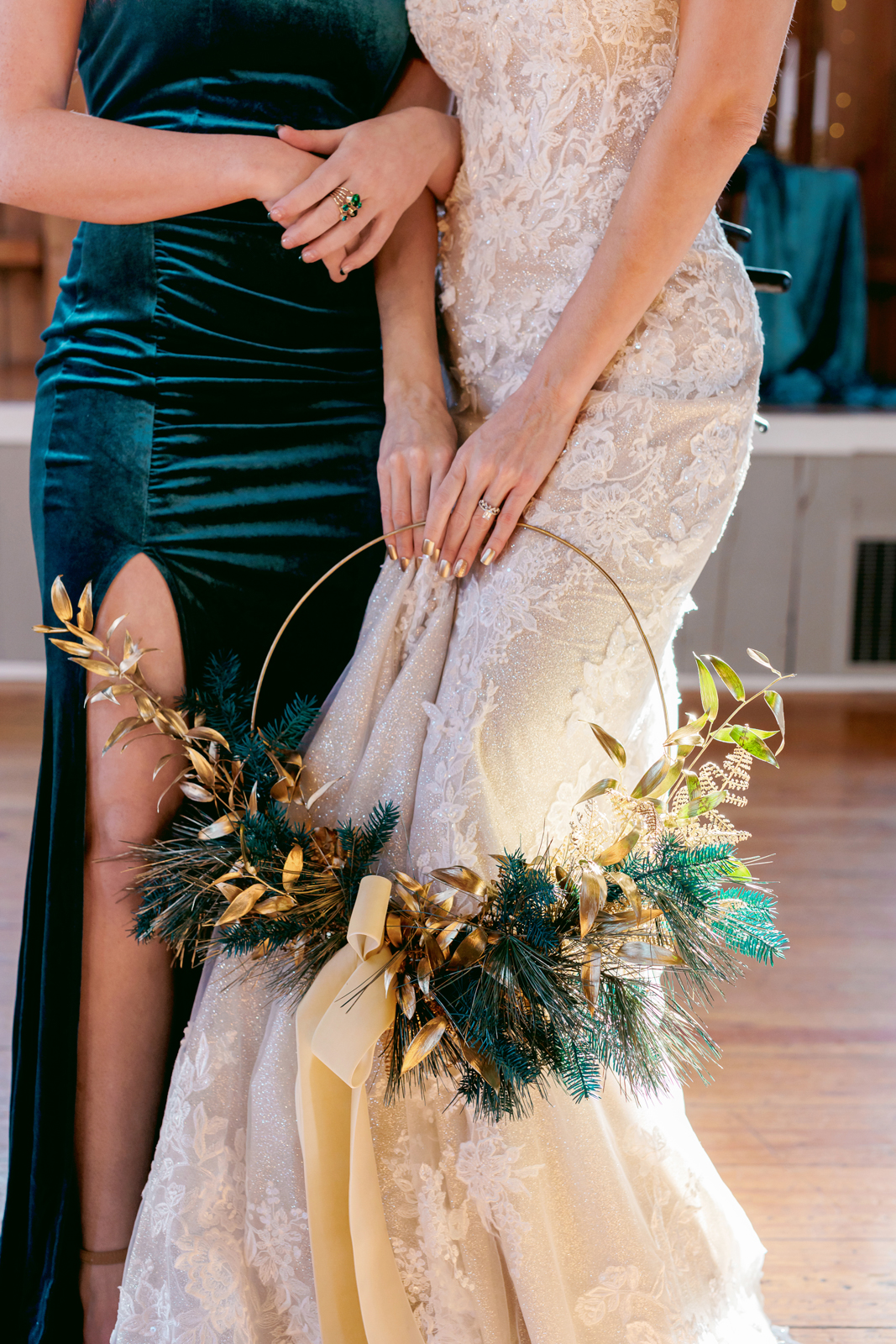 Rich, velvety teal and shimmering gold details created a unique and captivating winter wedding design at Harvest Moon Pond, bringing all the glam of a near-Christmas wedding without the traditional red and green color palette. With coordination, design, floral, and rentals by Melody Rose Designs, the charming barn space was transformed into an elegant and cozy winter wonderland. Sprayed evergreen branches and gold-painted ruscus were creatively arranged as garlands, draping across the reception table, chandeliers, and fireplace mantle and forming unique hoop bouquets for the bride and her maid of honor!