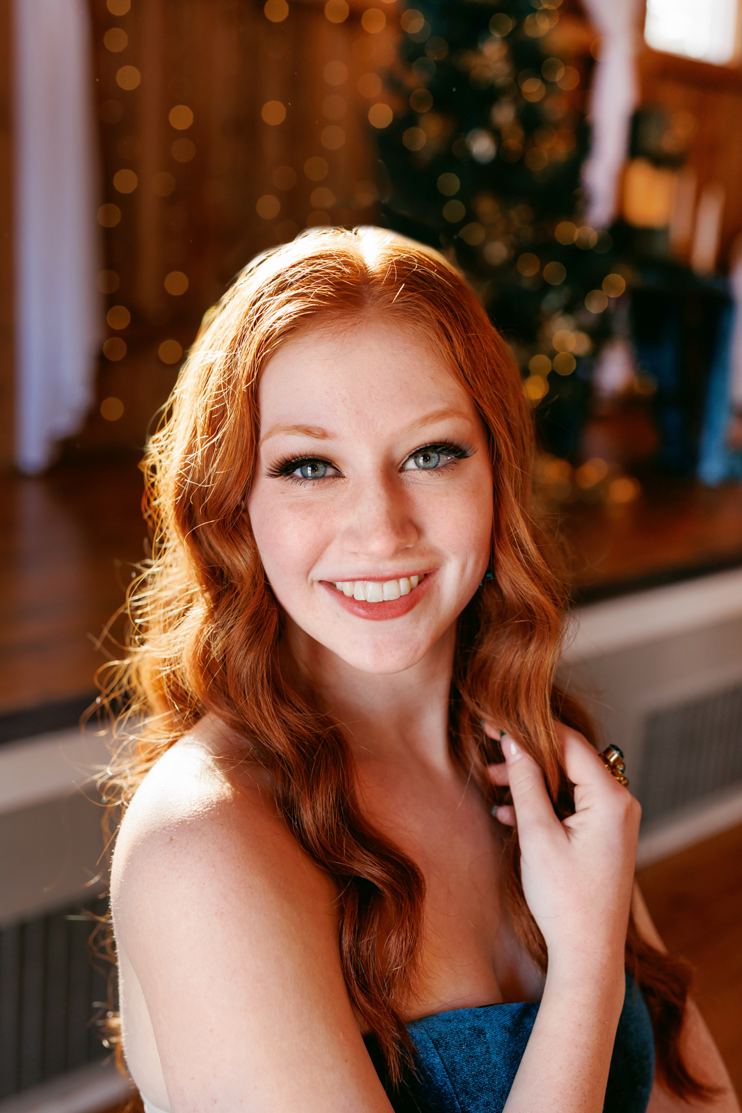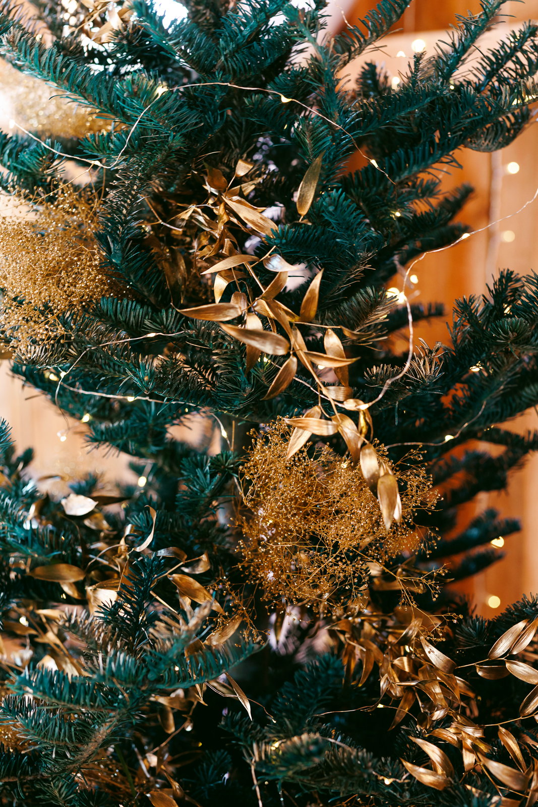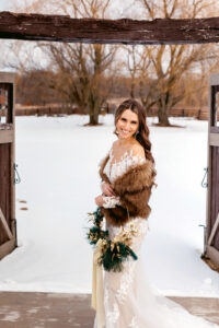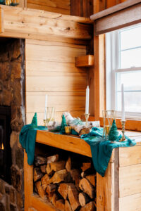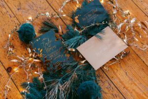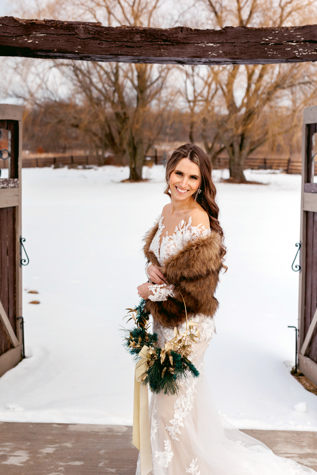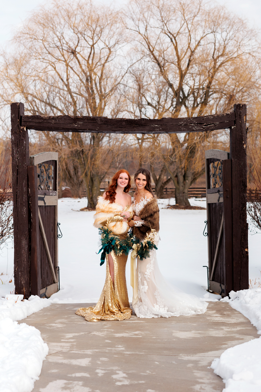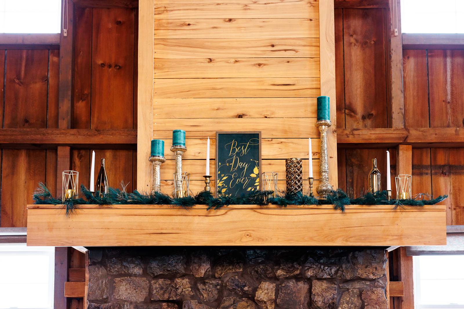 Rich, velvety teal and shimmering gold details created a unique and captivating winter wedding design at Harvest Moon Pond, bringing all the glam of a near-Christmas wedding without the traditional red and green color palette. With coordination, design, floral, and rentals by Melody Rose Designs, the charming barn space was transformed into an elegant and cozy winter wonderland. Sprayed evergreen branches and gold-painted ruscus were creatively arranged as garlands, draping across the reception table, chandeliers, and fireplace mantle and forming unique hoop bouquets for the bride and her maid of honor!