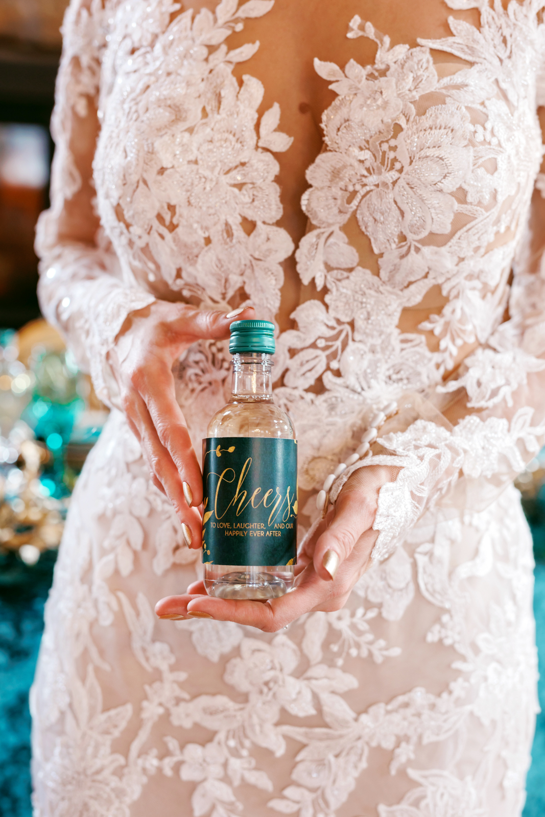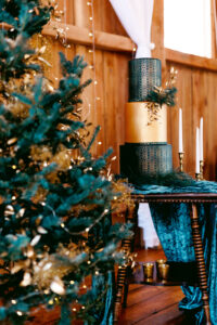 Craig’s Cake Shop displayed a mesmerizing and intricately patterned 3-tiered cake creation that served as an eye-catching focal point of the reception, positioned near a faux evergreen tree to embrace the seasonal elements. Brandi’s Bridal Galleria, Etc. outfitted the bride not with one, but two gowns to celebrate her day: one with sleeves and one with sparkle, perfect for an outfit change! LK Bridal Studio beautifully captured the celebration and provided luxurious stationery and signage pieces that elevated the day’s design. From a deep teal and gold-foil invitation suite to laser-cut place cards, custom champagne bottles, and beyond, they crafted cohesive and personalized elements that impacted both the design and the guest experience! We can’t wait for you to get inspired by every glitzy and glamorous detail below as you plan your own winter wedding day. Cheers!