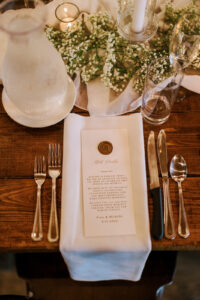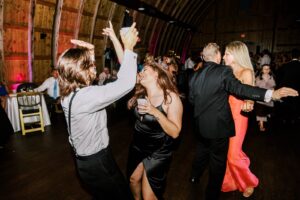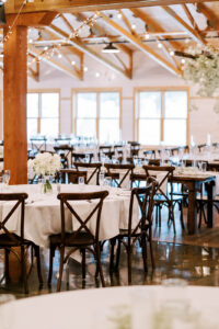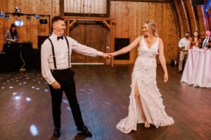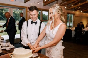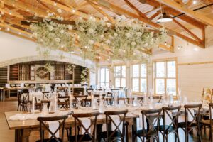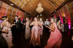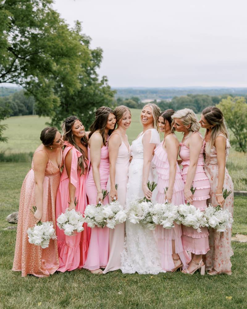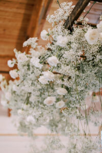 The two were excited to find their ideal venue at Vennebu Hill, which offered multiple spaces for guests to move around and celebrate in. Their monochromatic wedding floral dreams came to life with Signature Events‘ stunning arrangements of baby’s breath, Playa Blanca roses, and more, including a breathtaking hanging installation over the reception’s King’s Table. From signature drinks to the prettiest-in-pink mismatched bridesmaid dresses, a cocktail hour band, reception dress change, and beyond – let’s hear it for the Hughes’!