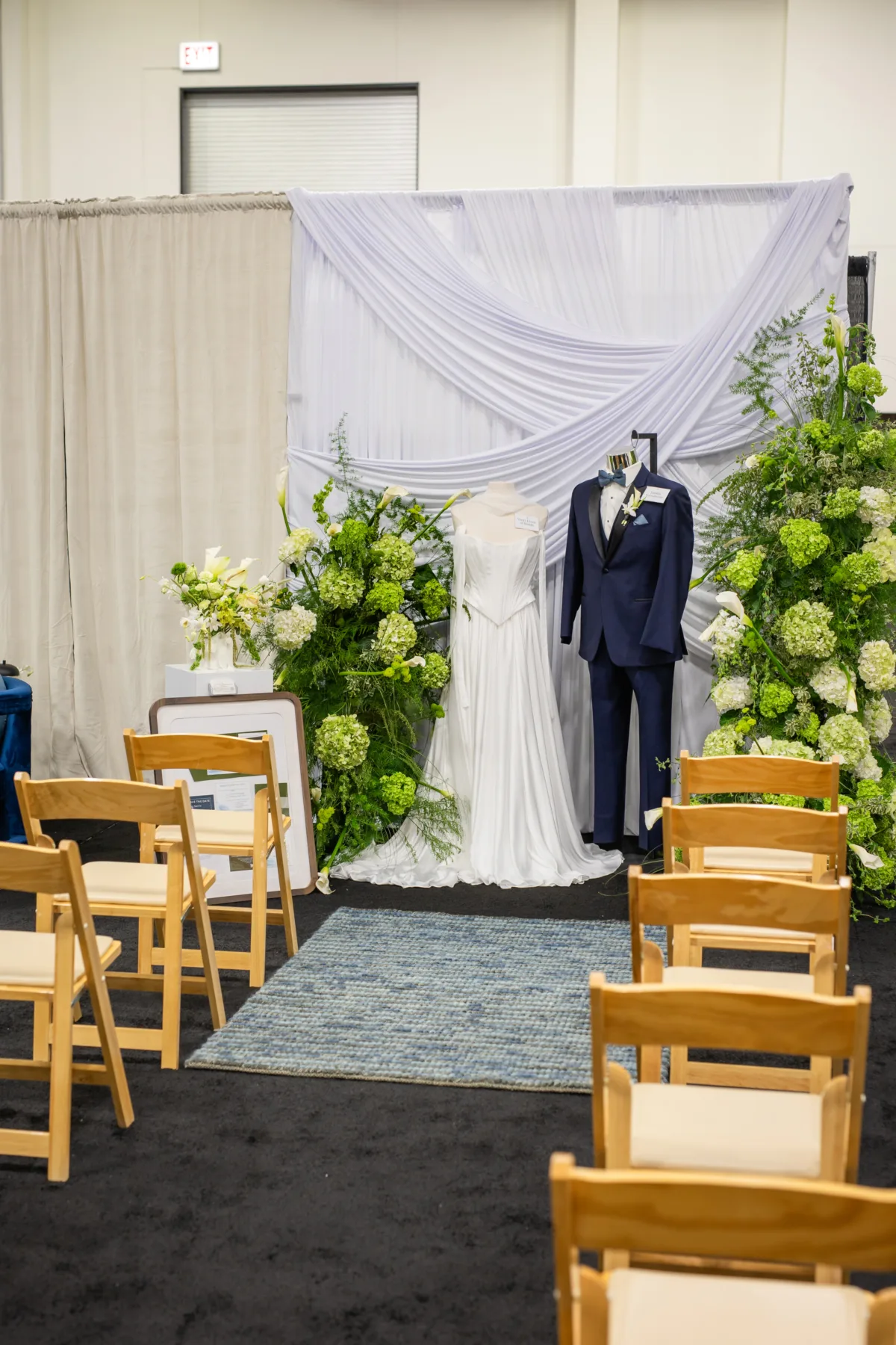 Final elements of the ceremony included a white draped backdrop from Daydream Design, a rug, and rows of natural wood seating.