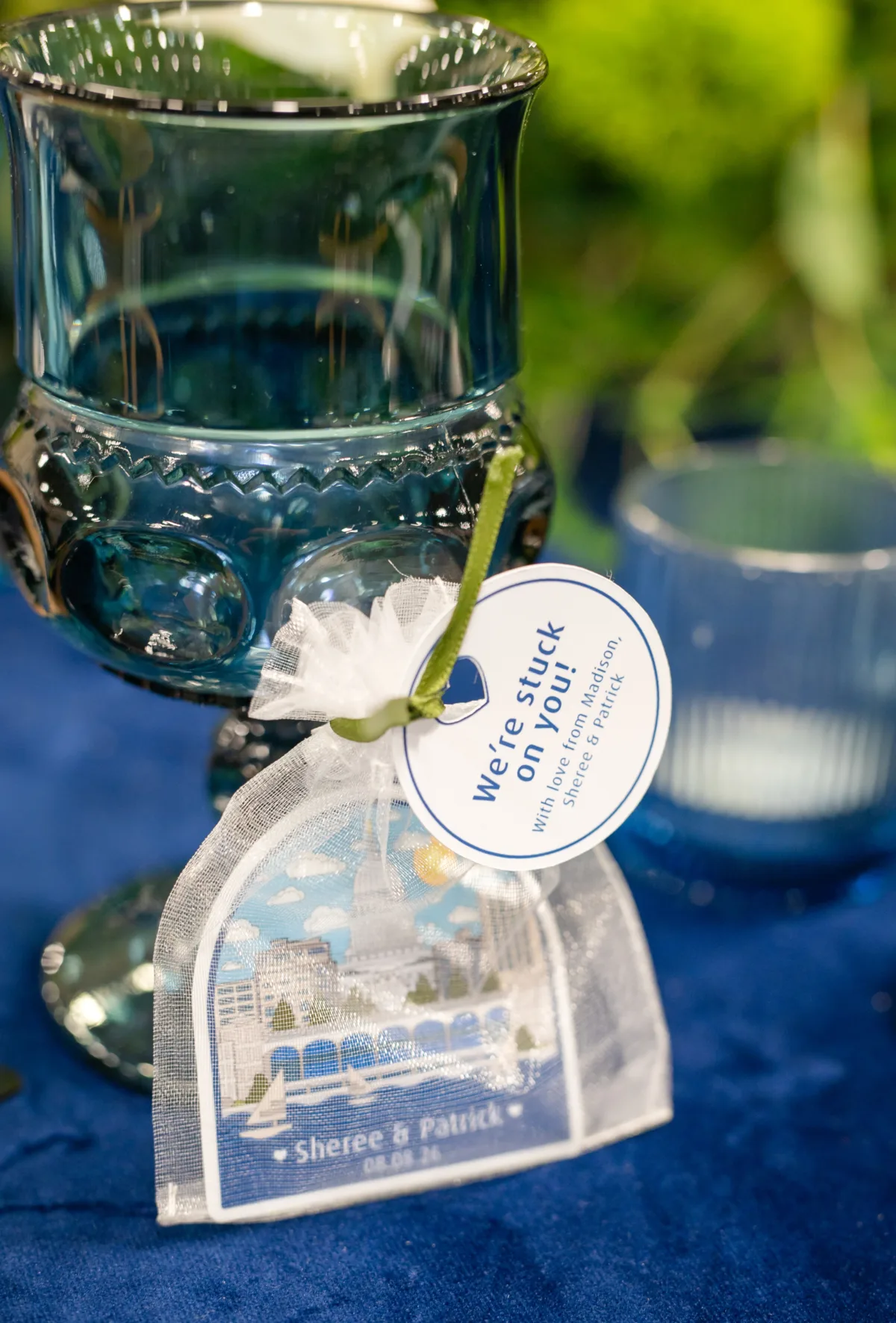 Sandy Kakes delivered a three-color, four-tier wedding cake, frosted with a wavy, blue ombre transitioning from dark to light. The cake sat atop an elevated dessert table, draped in a Madison isthmus tablecloth, as a final nod to local love.