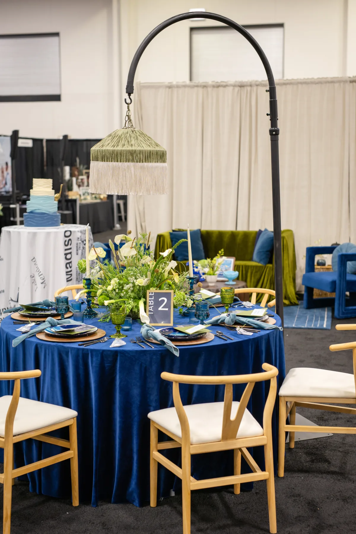 When it came to their WedPlan Winter Show scape, OSO IN LOVE found inspiration right at home. In honor of Wisconsin’s many lakes, as well as Madison’s Lake Mendota, they created a color palette of greens and blues, bookended by black and white. The Love Letter to Madison also included mid-century modern details and nods to the state’s iconic Architect, Frank Lloyd Wright.