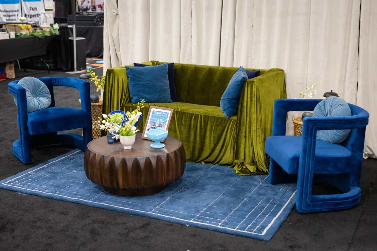 Along with Event Essentials, Velvet Rentals also provided rental pieces for the scape. Their blue Loren Armchairs and Audrey Coffee Table were fixtures in the lounge, while their wavy full-length mirror provided photo opportunities to passersby.