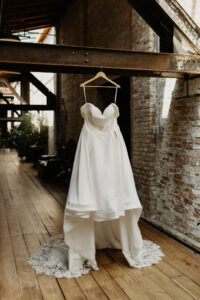In addition to the rentals provided by Garver Feed Mill, Event Essentials provided many supporting details and decor throughout the day. The couple’s vendor team worked together to create an artistic backdrop for the ceremony, full of lush white florals with plenty of greenery.