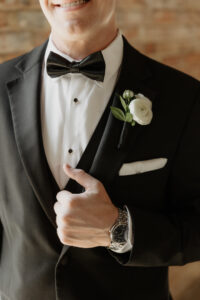 The couple arranged many personal details for their timeless, elegant, and classic wedding, beginning with small gifts and accessories. Laura had a custom embroidered handkerchief made for Mark, writing, “See you at the altar! 4.27.24.” She also gifted him custom cufflinks with their cat, Addi, on them to include their beloved pet in the day.