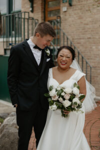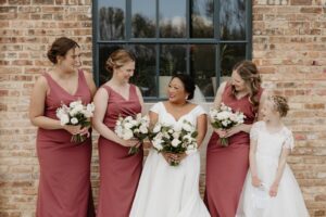 Laura said yes in her dream dress from Premiere Couture, a gown with simple, sleek fabric, a sweetheart neckline, cap sleeves, tie corset back, and a flowing lace train. Her hair was styled into a low bun, while her makeup accentuated her natural beauty, with rosy cheeks and a bold red lip. Her bridal party also added a pop of color with matching v-neck mauve dresses that coordinated perfectly with the groomsmen’s ties.