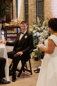 After the ceremony, Garver Events catered a cocktail hour where guests mingled and snacked on a charcuterie assortment of Wisconsin favorite cheeses. Later in the night, they also served a delicious dinner. Guests signed a copy of “Madison in Focus” to highlight the city’s history, which was a creative nod to the venue’s history.