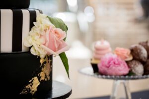 The black and white four-tiered cake from Gigi’s Cupcakes in today’s inspiration shoot is what wedding dreams are made of. And not to mention the stunning tall centerpieces of blooms and a champagne escort table, yes, please – we’ll cheers to that! It’s bringing glamour and romance to downtown Madison with the most exquisite architecture at the Overture Center for the Arts with design and florals by Momentum Floral. See it all unfold below with the prettiest of imagery by Urban Anchor Photography.