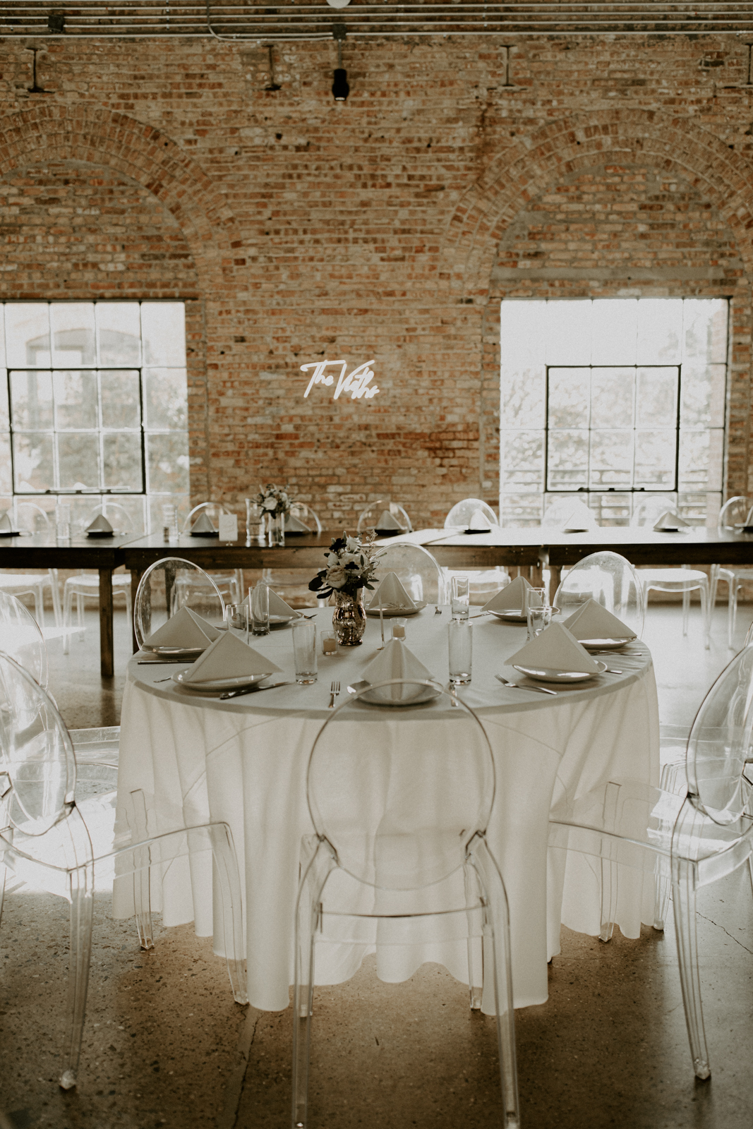 Paige and Matthew’s celebration of love was a mix of modern, industrial vibes and muted tones with hints of gold, making for a dazzling day at Garver Events. Fresh floral designs from B-Style Floral were the perfect match for the creamy neutral hues and minimalistic decor style of the celebration. Paige was stunning in her elegant and whimsical gown from Vera’s House of Bridals, while her bridesmaids embraced the nude palette with their dresses from Brandi’s Bridal Galleria, Etc. With the help of Event Essentials’ rental items, like sleek, acrylic ghost chairs, these two embraced a simple, contemporary-chic look to let the industrial backdrop of Garver Events shine!