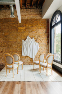 Ellsworth Block in downtown Madison provided an ideal setting for a celebration highlighting natural textures. This unique event space, a restored historical gem on Capitol Square, boasts sandstone and brick walls, wooden floors, tall ceilings, and a glass skylight that provides ample natural light. The versatile space also includes a bold, geometric iron framework distinctive to the time of construction in 1871.