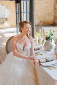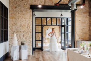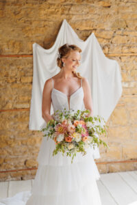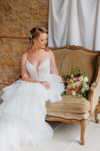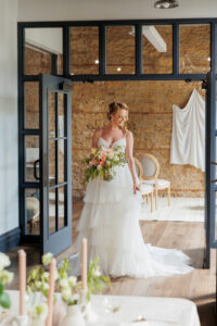 Brandi’s Bridal Galleria, Etc. fashioned our stunning bride in the “Jasper” gown by All Who Wander. This dress was perfect for an organic-themed wedding celebration, featuring tiered layers, lightly textured fabric, and a structured bodice with a tasteful deep neckline. Its wispy, ethereal, and airy quality playfully contrasted with the setting’s geometric framework and coarse brick walls.